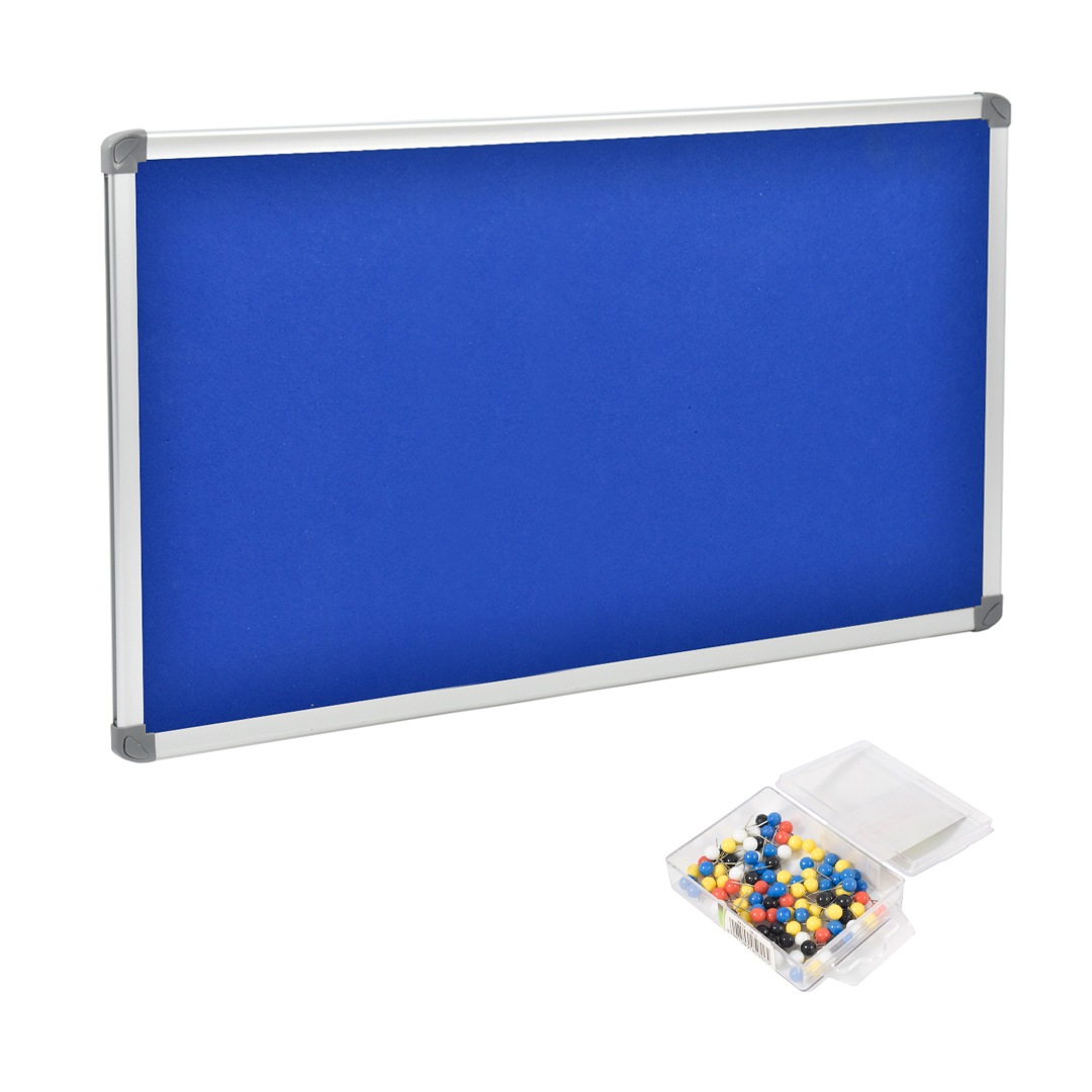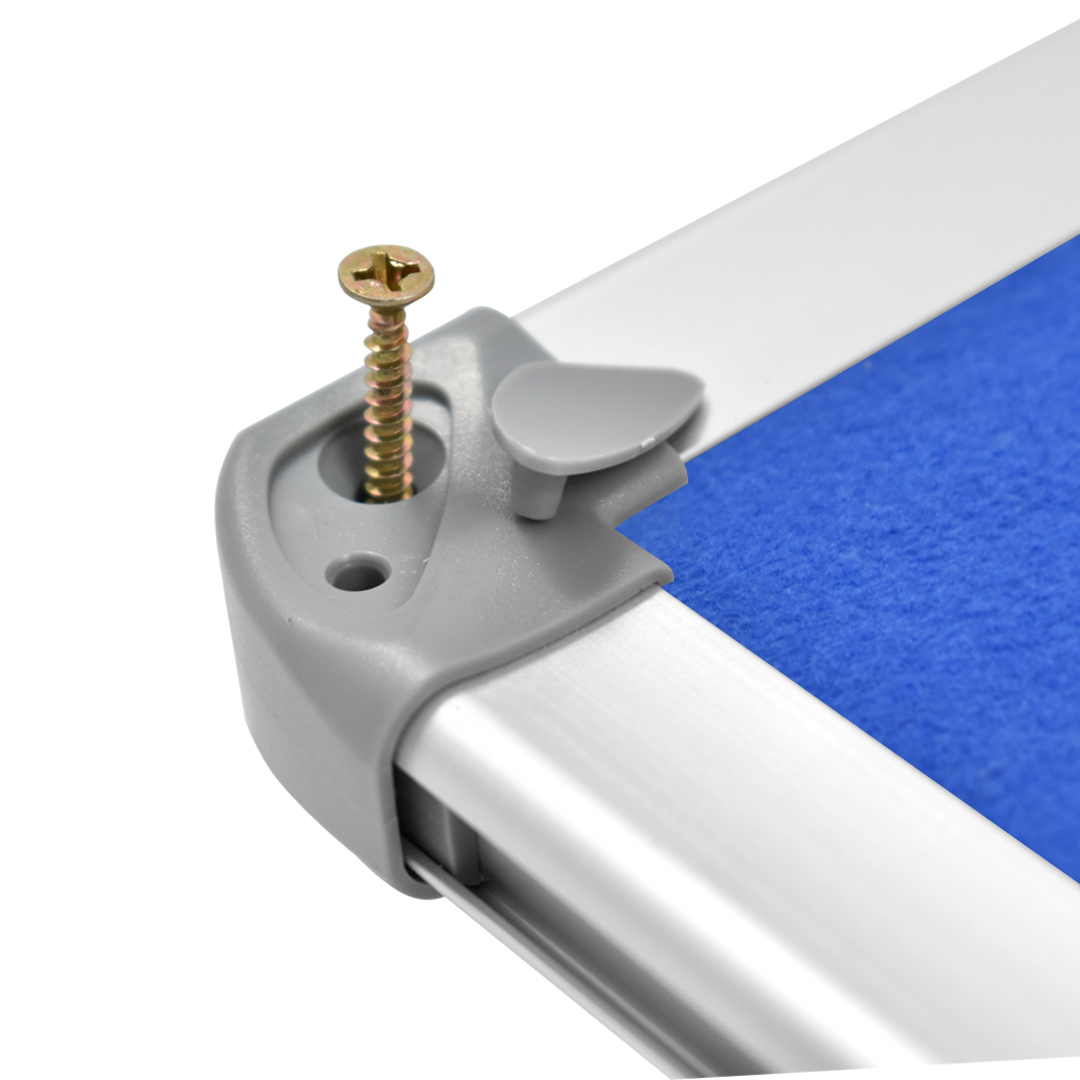 Trasforma il tuo spazio lavorativo con la nostra elegante lavagna con fondo in feltro BLU. Dotata di una cornice in alluminio anodizzato color argento e angoli in ABS, questa lavagna è la soluzione perfetta per fissare facilmente i tuoi documenti temporanei a parete.