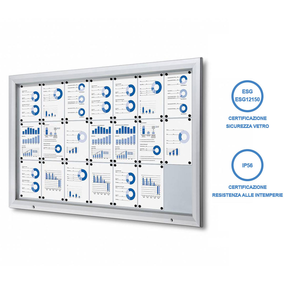 Bacheca certificata per esterno:- fondo magnetico in lamiera bianca;- struttura in alluminio estruso;- anta in vetro temperato di sicurezza ESG;- apertura a ribalta;- serratura con chiavi in dotazione;- certificazione IP56 per uso esterno.