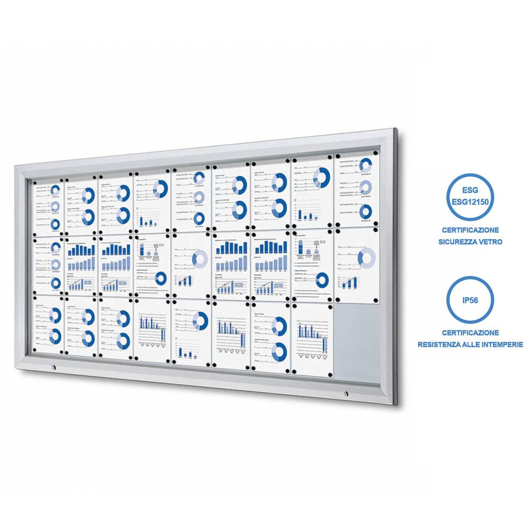 Bacheca certificata per esterno:- fondo magnetico in lamiera bianca;- struttura in alluminio estruso;- anta in vetro temperato di sicurezza ESG;- apertura a ribalta;- serratura con chiavi in dotazione;- certificazione IP56 per uso esterno.