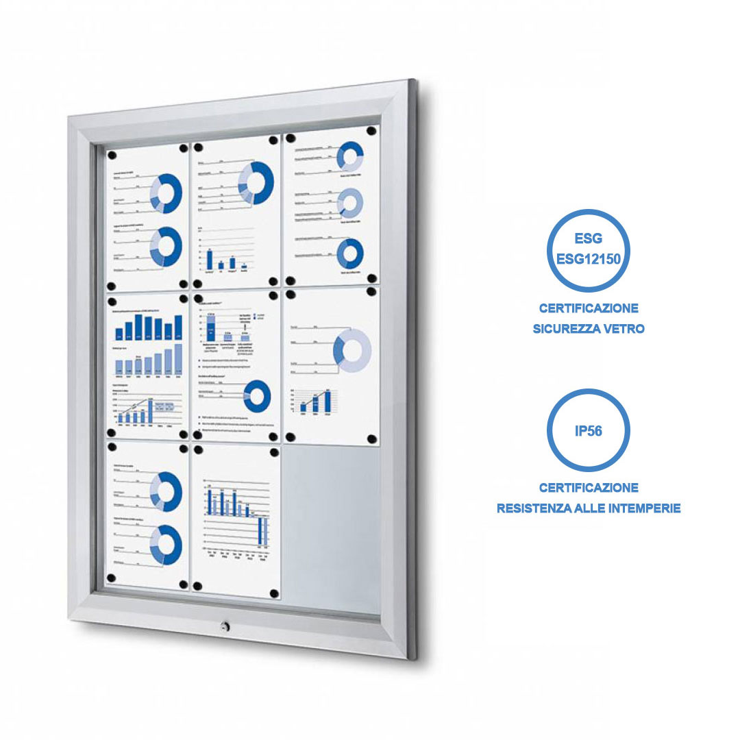 Bacheca certificata per esterno:- fondo magnetico in lamiera bianca;- struttura in alluminio estruso;- anta in vetro temperato di sicurezza ESG;- apertura a ribalta;- serratura con chiavi in dotazione;- certificazione IP56 per uso esterno.