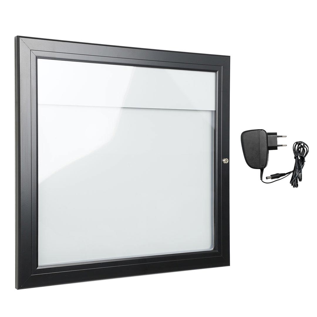 Bacheca porta menù:- illuminazione a LED;- struttura in finitura nera;- pannello superiore personalizzabile;- anta in policarbonato trasparente;- fissaggio a parete;- per uso esterno.