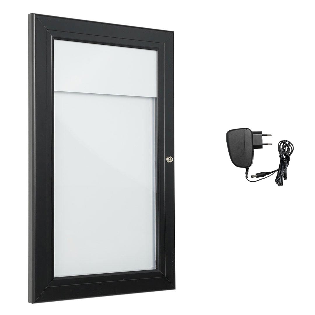 Bacheca porta menù:- illuminazione a LED;- struttura in finitura nera;- pannello superiore personalizzabile;- anta in policarbonato trasparente;- fissaggio a parete;- per uso esterno.