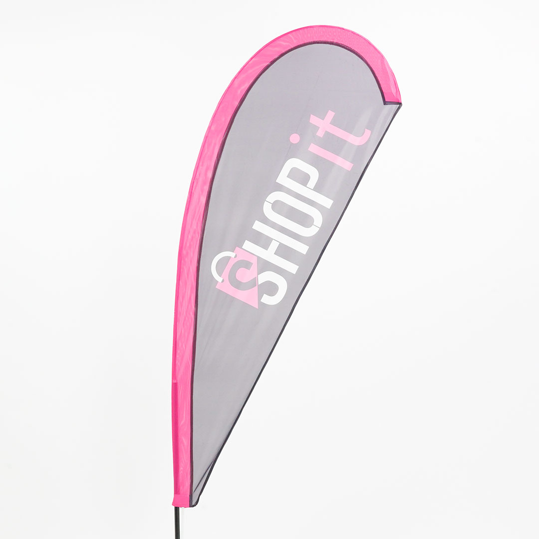 Bandiera pubblicitaria:- a GOCCIA;- asta flessibile in fibra di vetro;- disponibile in tre misure;- stampa sublimatica monofacciale su telo nautico;- per interni/esterni.