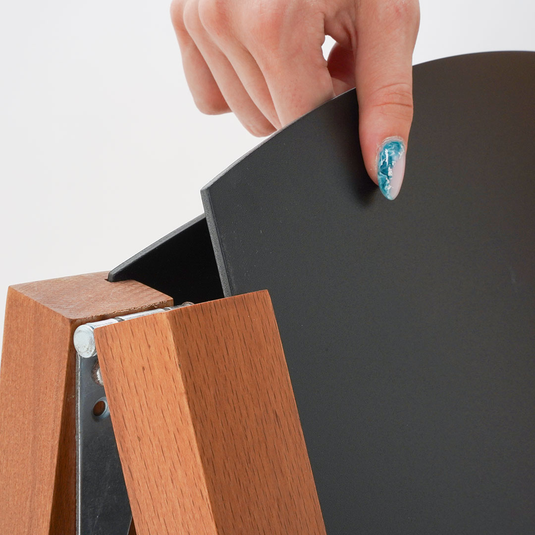 Scopri la versatile lavagna a cavalletto in legno della linea Fast Switch, progettata per elevare la comunicazione della tua attività. Con la sua cornice in legno di faggio massiccio e finitura Teak, questa lavagna bifacciale offre durata e stile senza pari.