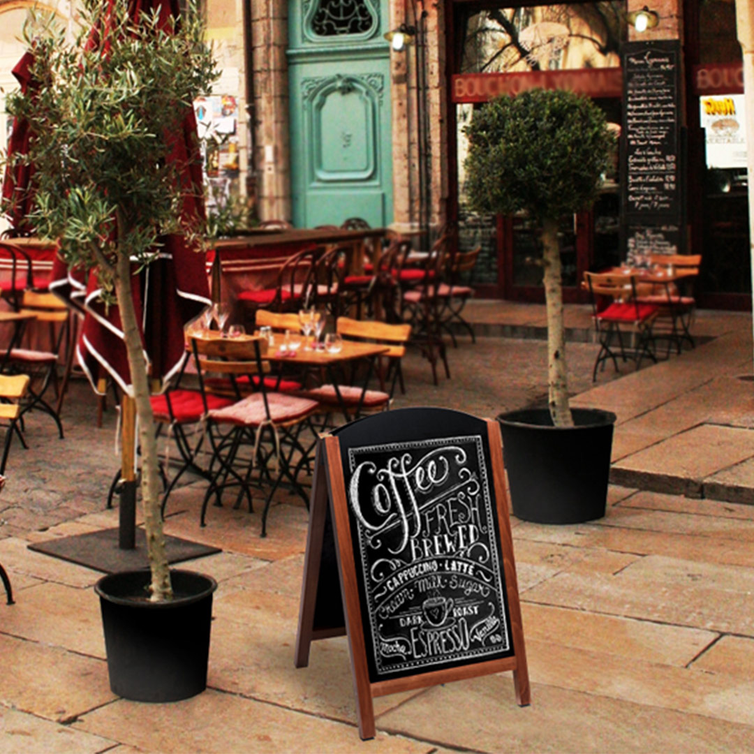 Lavagna a cavalletto:- in legno di faggio massiccio;- finitura Teak;- bifacciale;- lavagne estraibili;- disponibile in due dimensioni;- per interno e esterno;- utilizzabile con gessi o marcatori a gesso liquido.