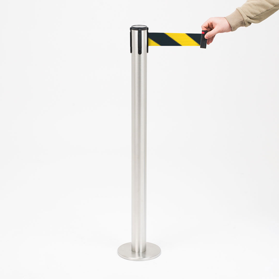 Il nastro da 3 metri è retrattile e dotato di sistema autofrenante per la massima sicurezza. Personalizzalo con il tuo logo o scritte informative per rendere unico il tuo spazio.
