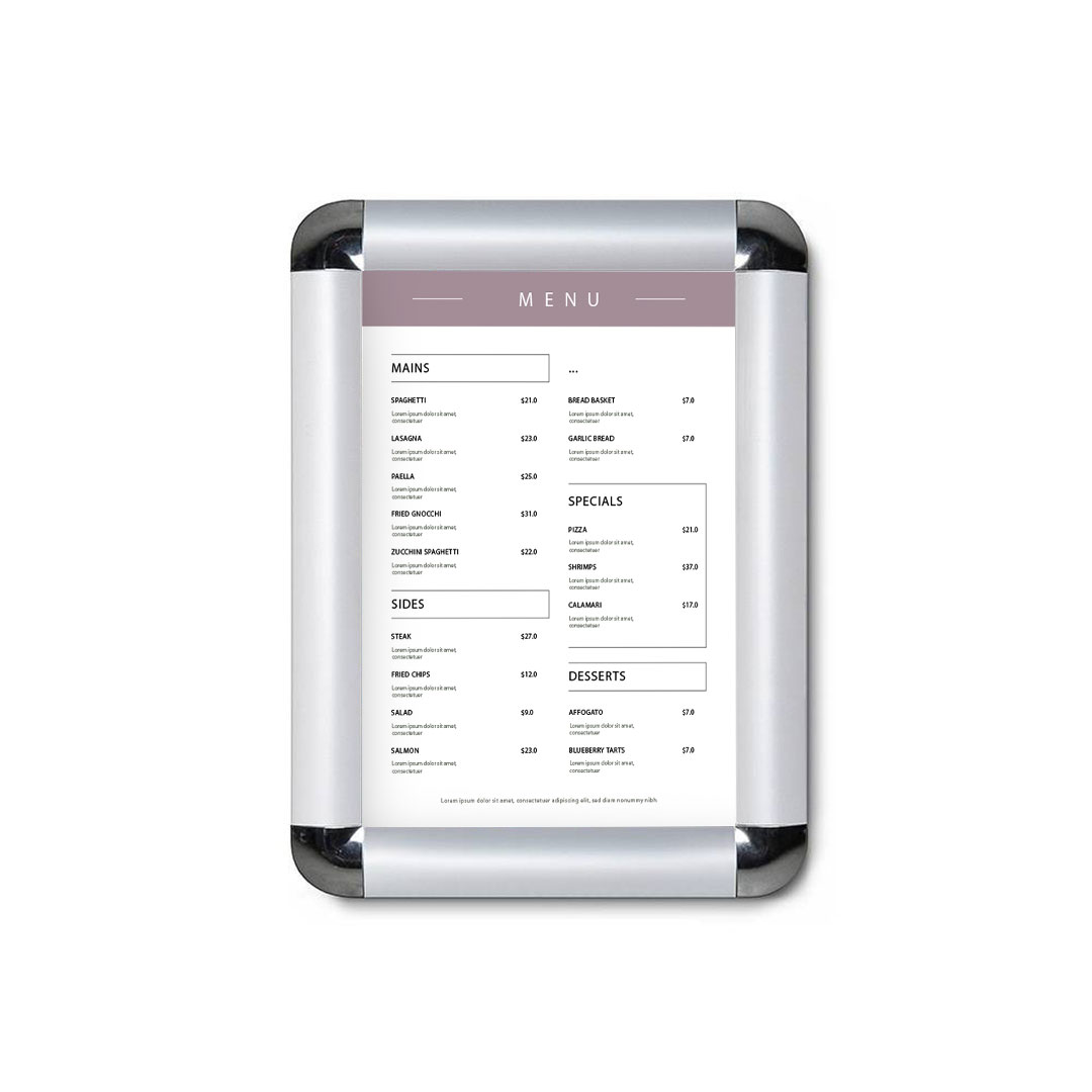 Ottimizza la comunicazione visiva della tua attività con la nostra innovativa cornice a scatto. Dotata di un design raffinato con angoli arrotondati cromati, questa soluzione è perfetta per uffici, librerie, scuole e qualsiasi ambiente che necessiti di esporre informazioni in modo professionale ed efficace.