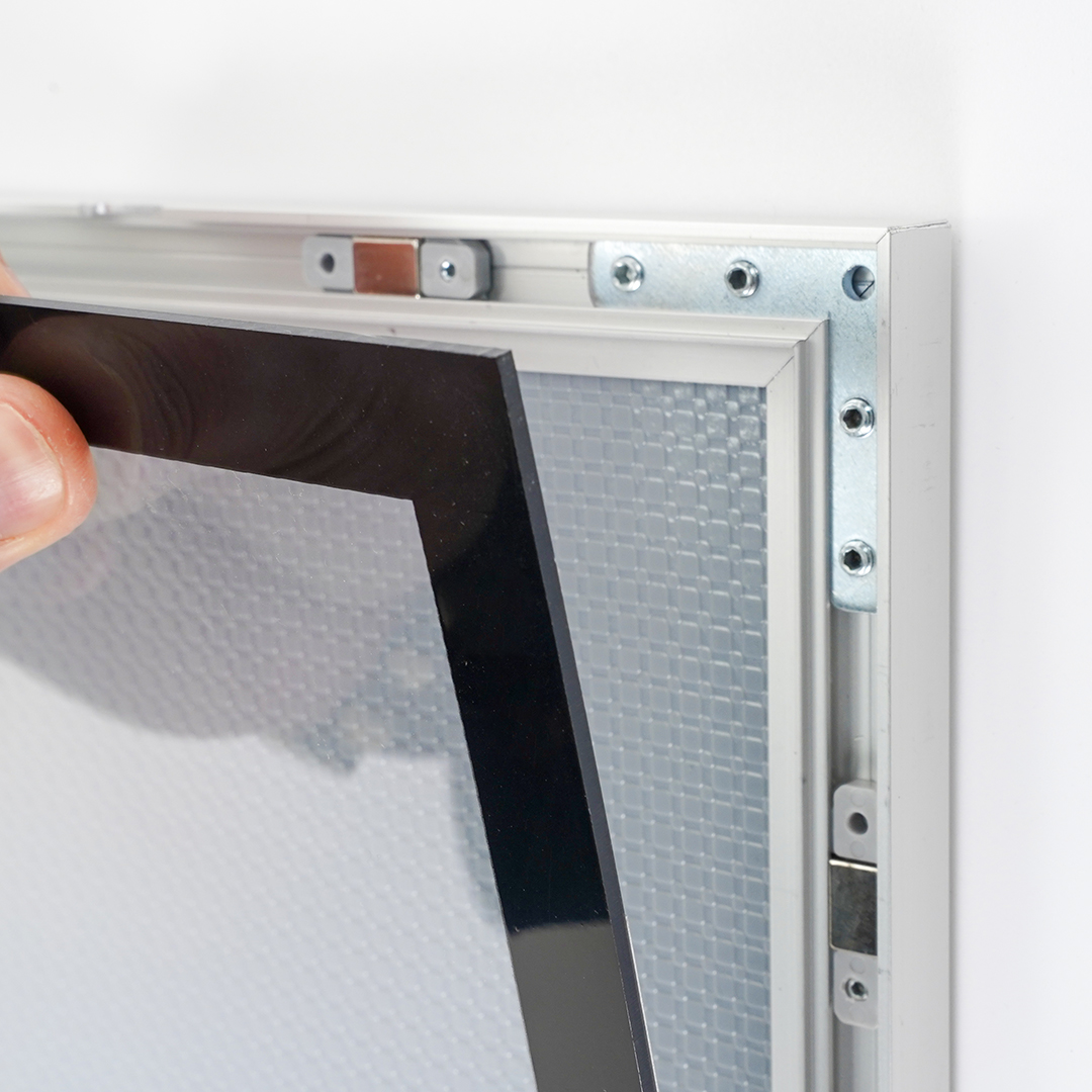 Cornice magnetica porta poster:- finitura nero lucido;- apertura/chiusura magnetica;- orientabile in verticale o orizzontale;- fissaggio con viti a scomparsa.