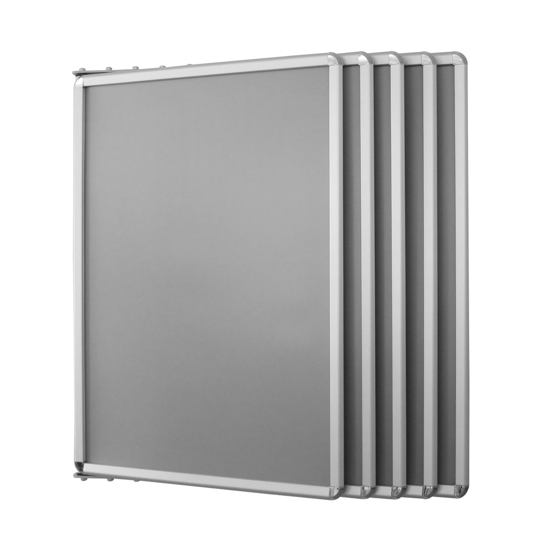 Espositore a libro da parete:- a 5, 10 o 12 cornici a scatto frame 32, angolo tondo;- f.to 50×100 cm o 70×100 cm;- attacco con barra lineare.