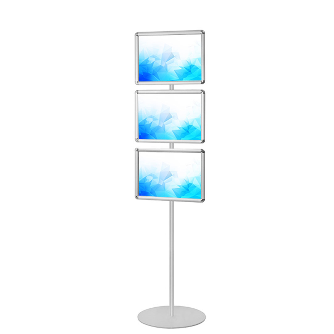 Cornice a scatto f.to A3 su piantana:- 3 cornici A3 monofacciali oppure 6 nella versione bifacciale;- angoli arrotondati cromati;- sistema di apertura a scatto;- montante in alluminio dia. 30 mm;- base circolare in metallo;- struttura silver o nera;- foglio di protezione in PVC trasparente e kit di montaggio in dotazione.