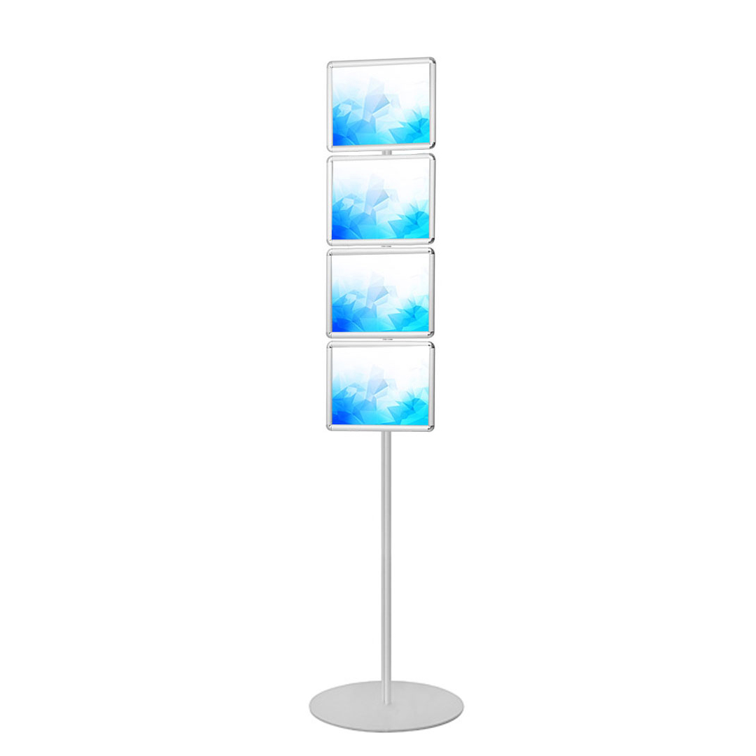 cornici a scatto formato A4 su piantana:- 4 cornici A4 monofacciali oppure 8 nella versione bifacciale;- angoli arrotondati cromati;- posizionabile sia in orizzontale, sia in verticale;- sistema di apertura a scatto;- montante in alluminio dia. 30 mm;- base circolare in metallo;- struttura silver o nera;- foglio di protezione in PVC trasparente e kit di montaggio in dotazione.