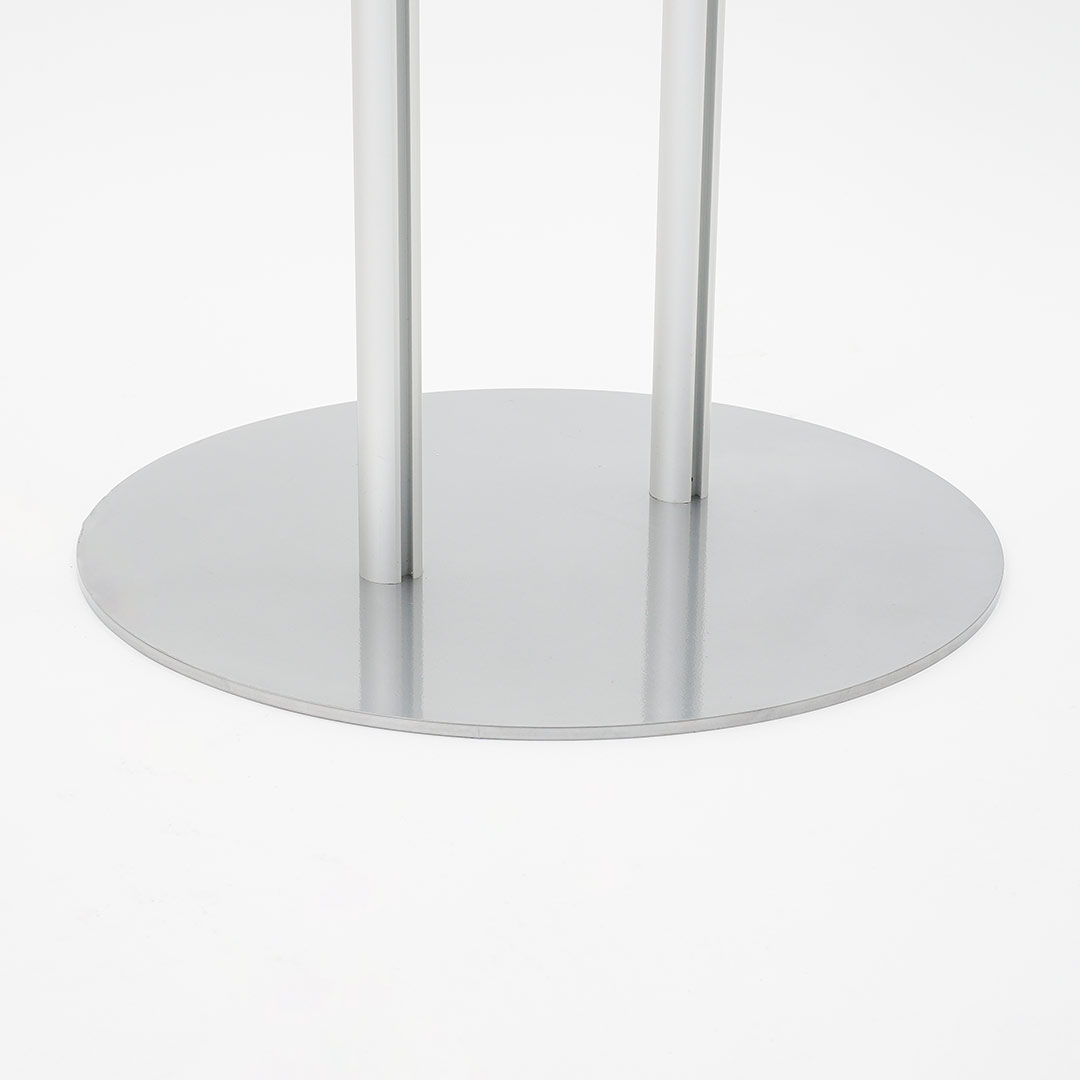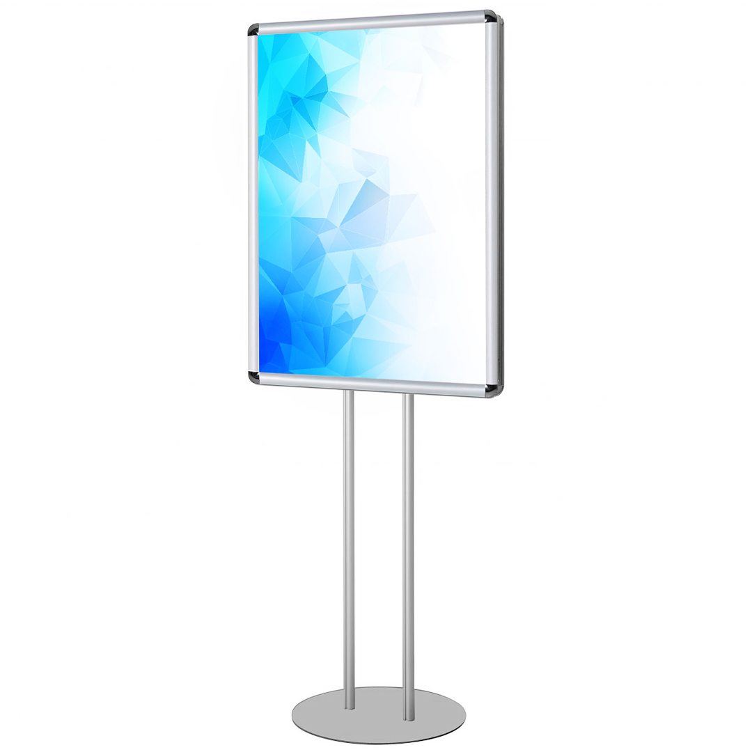 Cornice a scatto f.to 50×70 cm su piantana:- angoli arrotondati cromati;- sistema di apertura a scatto;- monofacciale e bifacciale;- doppio montante in alluminio dia. 30 mm;- base circolare in metallo;- struttura silver o nera;- foglio di protezione in PVC trasparente e kit di montaggio in dotazione.