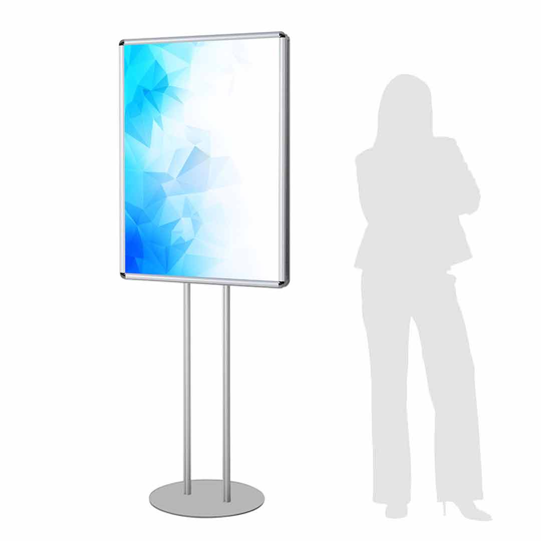 Cornice a scatto f.to 70×100 cm su piantana:- angoli arrotondati cromati;- sistema di apertura a scatto;- monofacciale e bifacciale;- doppio montante in alluminio dia. 30 mm;- base circolare in metallo;- struttura silver o nera;- foglio di protezione in PVC trasparente e kit di montaggio in dotazione.