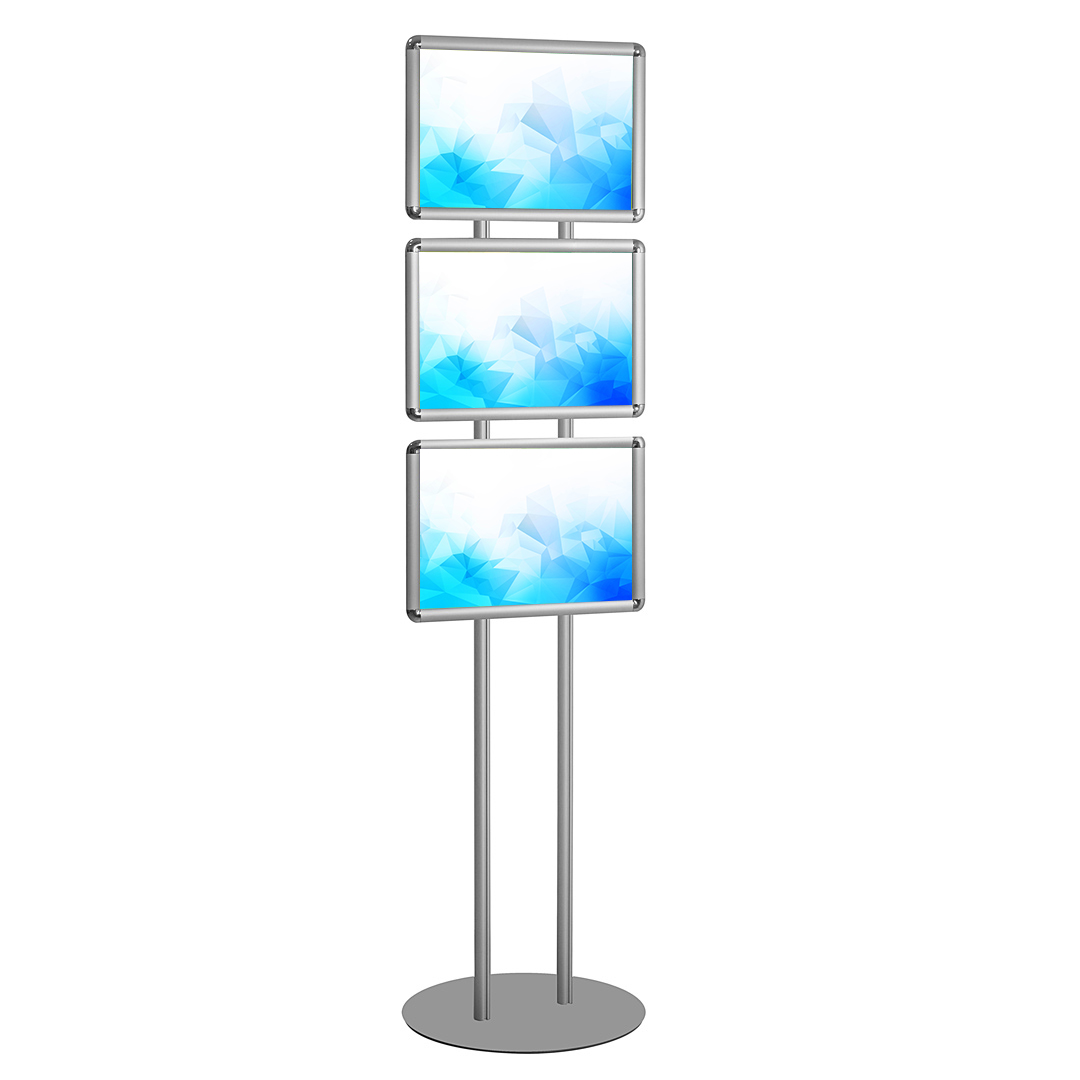 Struttura autoportante con cornici a scatto formato A3:- 3 cornici A3 monofacciali oppure 6 nella versione bifacciale;- angoli arrotondati cromati;- sistema di apertura a scatto;- montante in alluminio dia. 30 mm;- base circolare in metallo;- struttura silver o nera;- foglio di protezione in PVC trasparente e kit di montaggio in dotazione.