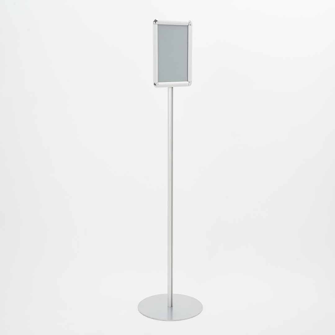 Cornice a scatto formato A4 su piantana:- angoli arrotondati cromati;- posizionabile sia in orizzontale, sia in verticale;- sistema di apertura a scatto;- monofacciale e bifacciale;- montante in alluminio dia. 30 mm;- base circolare in metallo;- struttura silver o nera;- foglio di protezione in PVC trasparente e kit di montaggio in dotazione.
