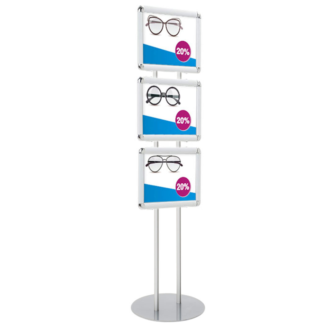 Struttura autoportante con cornici a scatto formato A3:- 3 cornici A3 monofacciali oppure 6 nella versione bifacciale;- angoli arrotondati cromati;- sistema di apertura a scatto;- montante in alluminio dia. 30 mm;- base circolare in metallo;- struttura silver o nera;- foglio di protezione in PVC trasparente e kit di montaggio in dotazione.