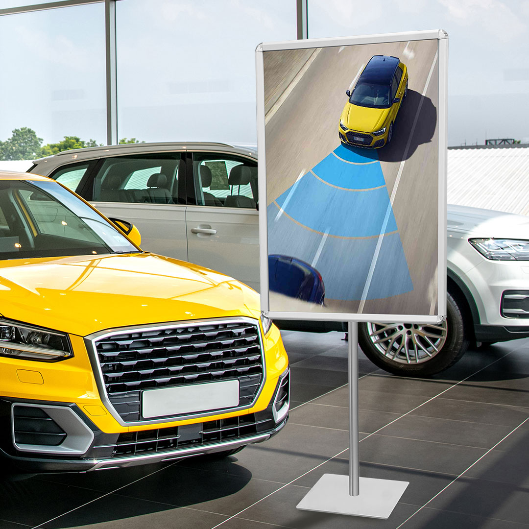 La linea QUADRO offre una soluzione elegante e funzionale per esporre i tuoi messaggi pubblicitari. La cornice a scatto permette cambi rapidi e senza sforzo dei tuoi poster, mentre il foglio di protezione in PVC antiriflesso assicura una visibilità ottimale in ogni condizione di illuminazione.