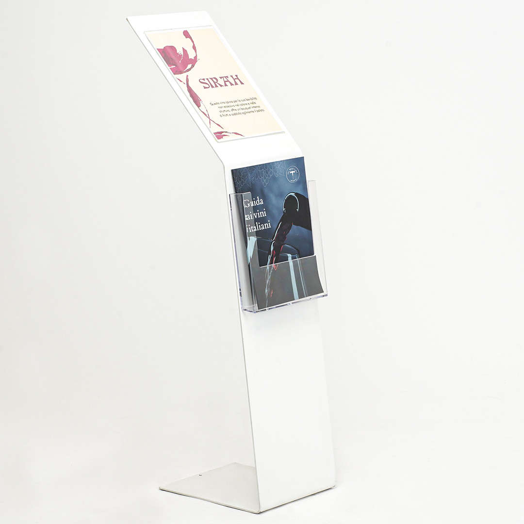 Leggio in metallo verniciato bianco:- modello con tasca porta avvisi f.to A4;- modello con doppia tasca porta avvisi f.to A4:- modello con tasca porta avvisi f.to A4 e tasca porta depliant f.to A4;- base a L, sp. 4 mm.