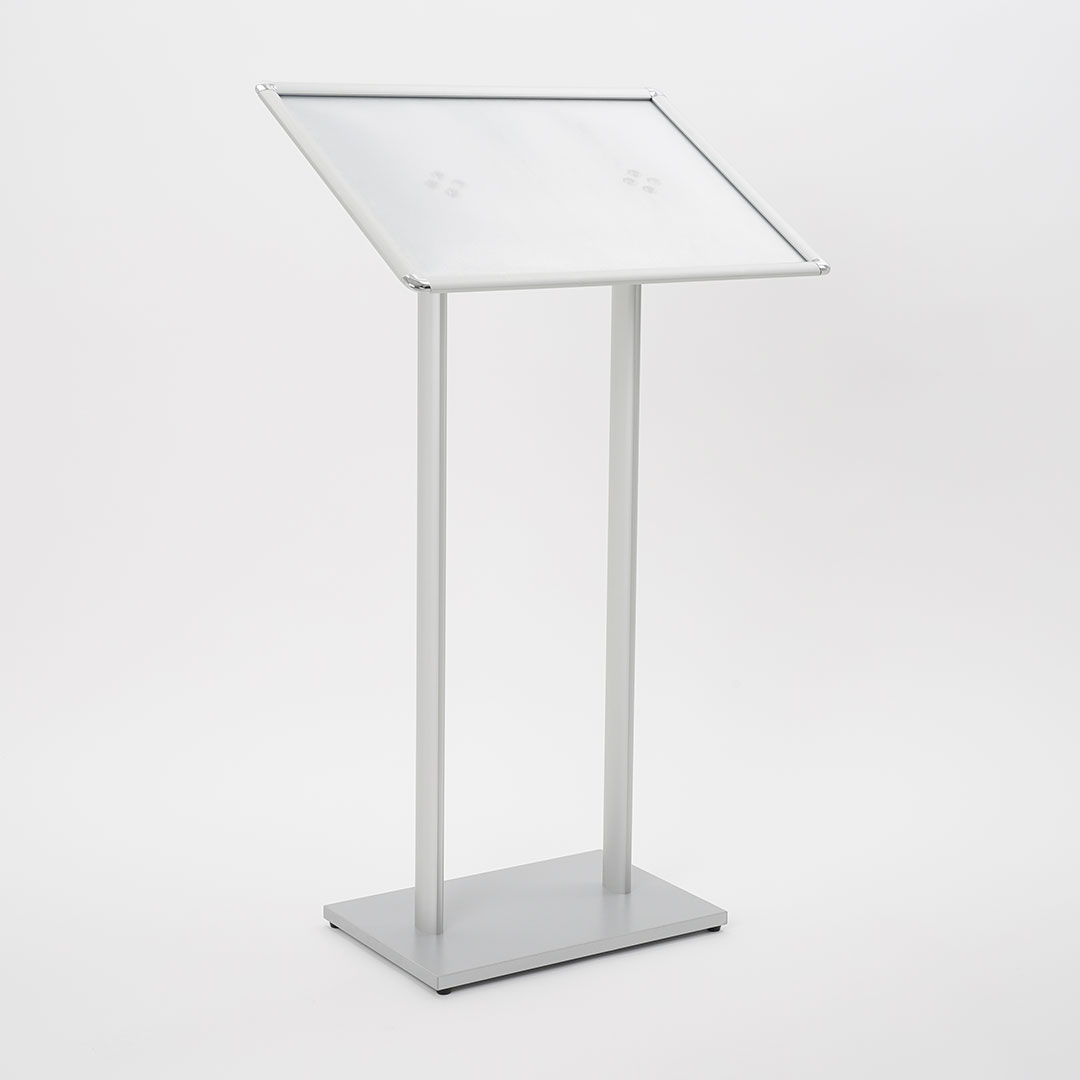 Leggio con cornice f.to A2 orizzontale, doppio montante in alluminio e base quadrata in MDF laccato