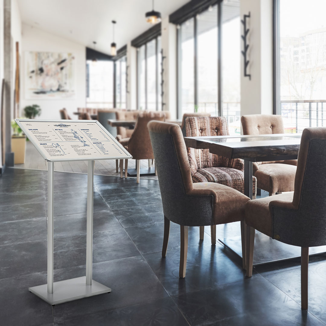La cornice a leggio ITV07_0005 è perfetta per esporre menu, offerte speciali, informazioni aziendali o qualsiasi altro contenuto tu desideri mettere in evidenza. La sua struttura robusta e il design elegante la rendono adatta a qualsiasi ambiente professionale.