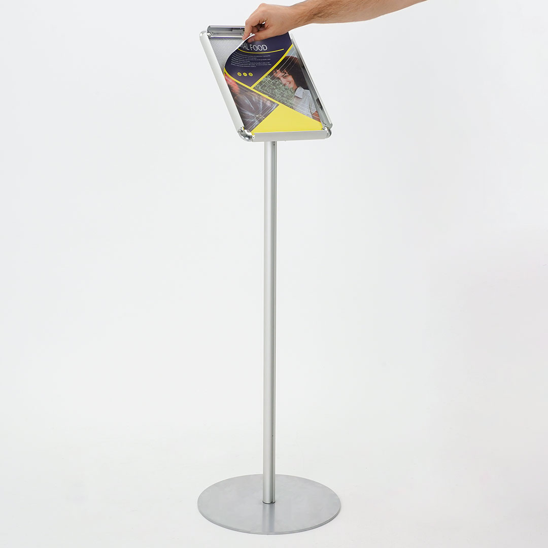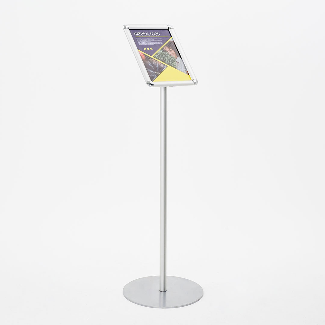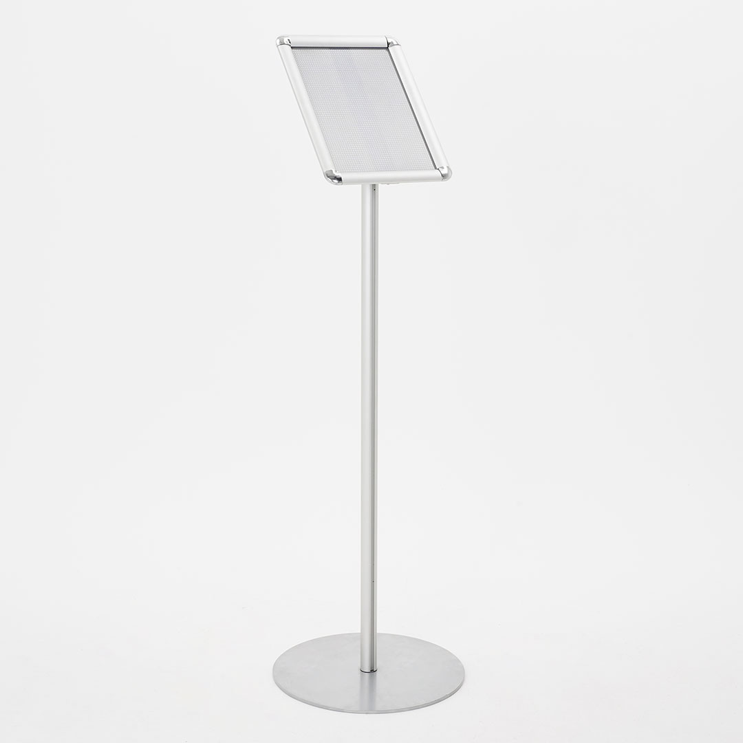 Cornice a scatto modello a leggio su piantana:- altezza del montante su richiesta;- cornice a scatto formato a4 e a3 con angoli tondi cromati;- cornice orientabile;- sistema di apertura a scatto;- base circolare verniciata silver;- foglio di protezione in dotazione.