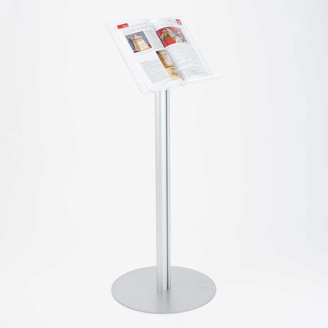 Leggio in plexiglass formato A3 orizzontale con ripiano portalibro, su piantana in alluminio con montante tondo o ovale. Robusto e stabile.