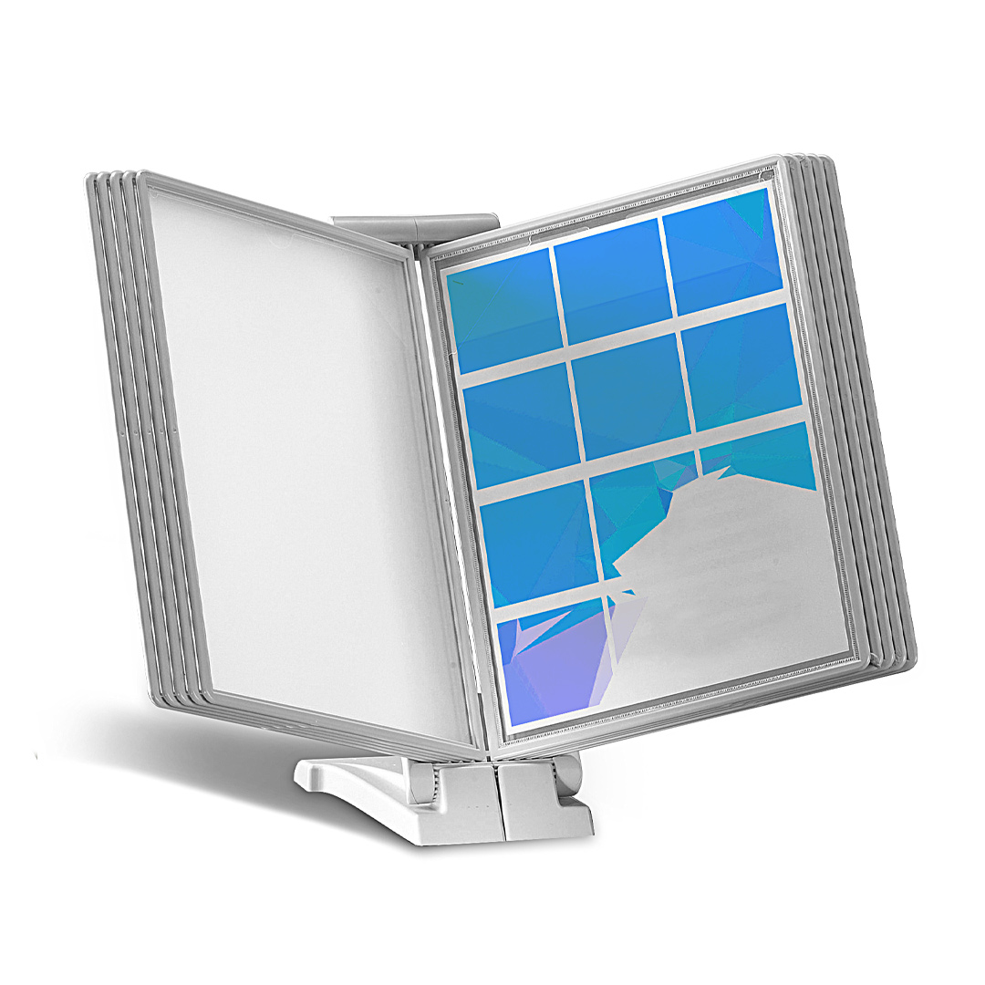 Espositore a libro in ABS silver, disponibile nella versione a 20 tasche formato A4 verticale removibili. Posizionabile