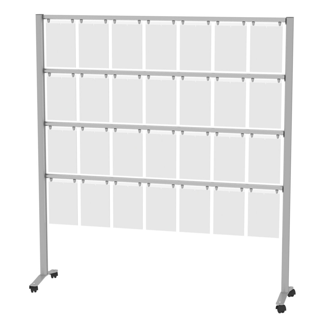 Espositore porta avvisi con ruote, traversi e 28 tasche f.to A4 verticale su 4 livelli – Montanti 70x45mm