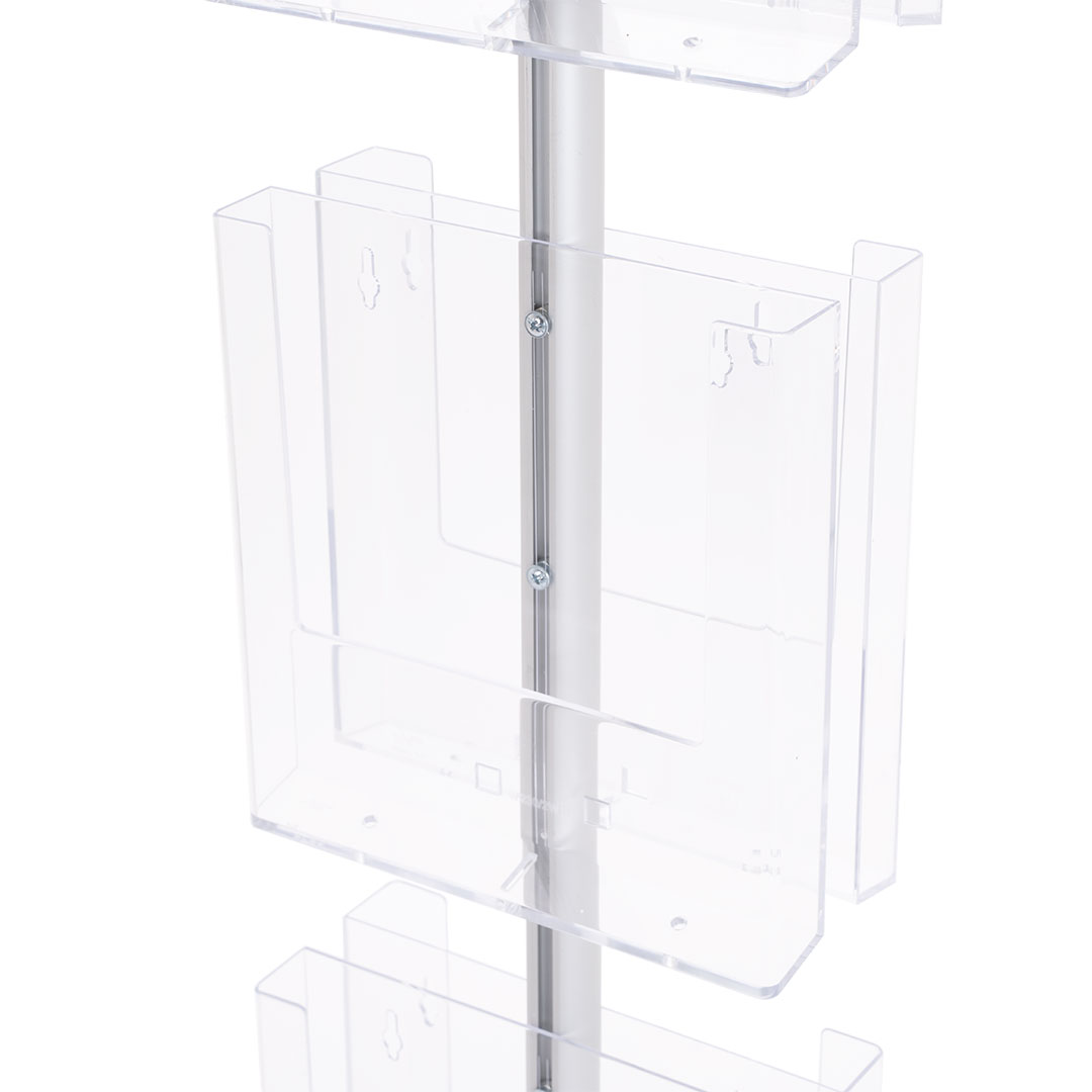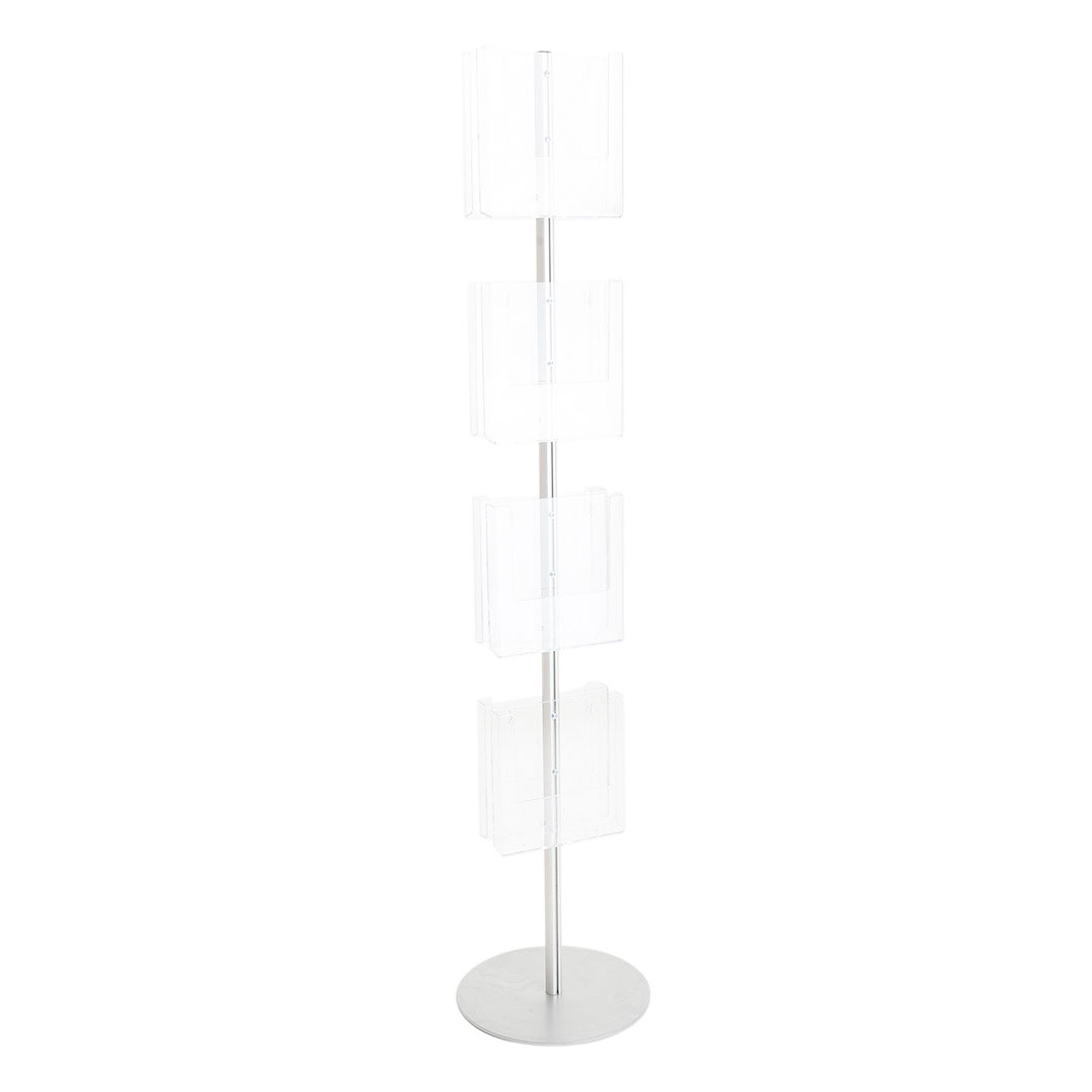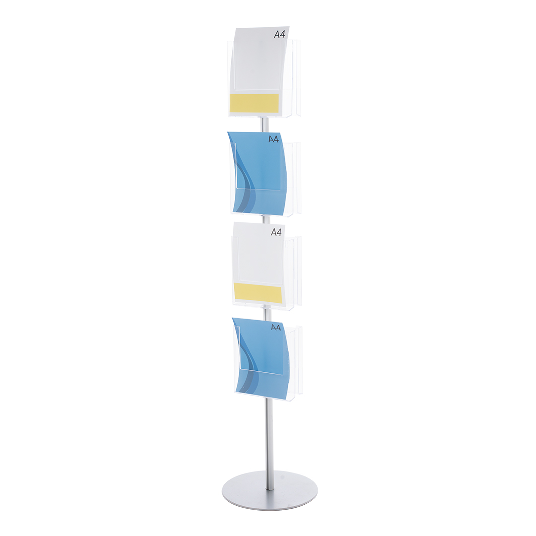 Espositore porta depliant serie EASY:- monofaccciale a 4 tasche in stirene f.to A4;- bifacciale ad 8 tasche in stirene f.to A4;- struttura autoportante;- in alluminio anodizzato silver;- altezza struttura 160 cm;- base circolare in metallo verniciato silver.