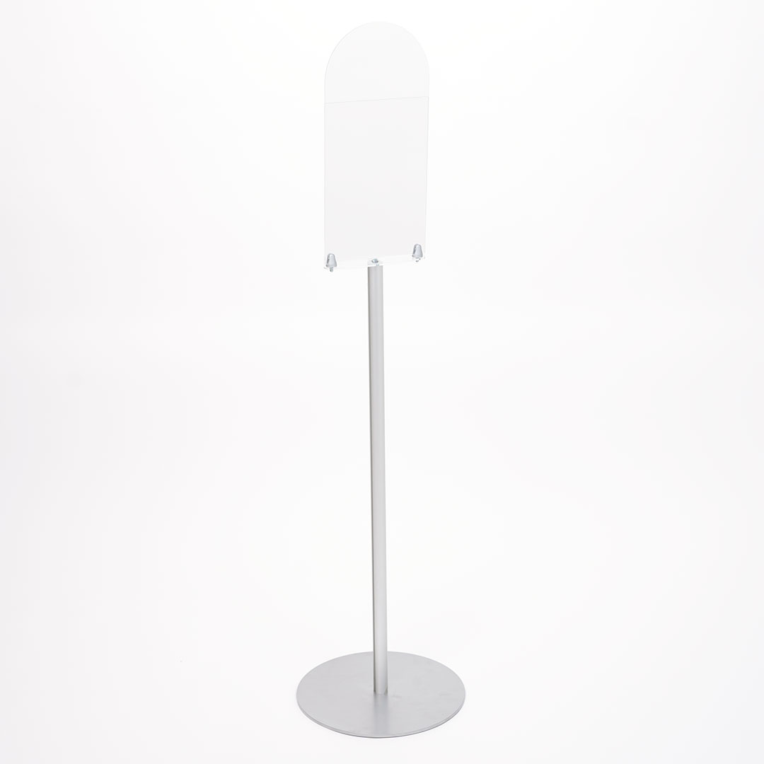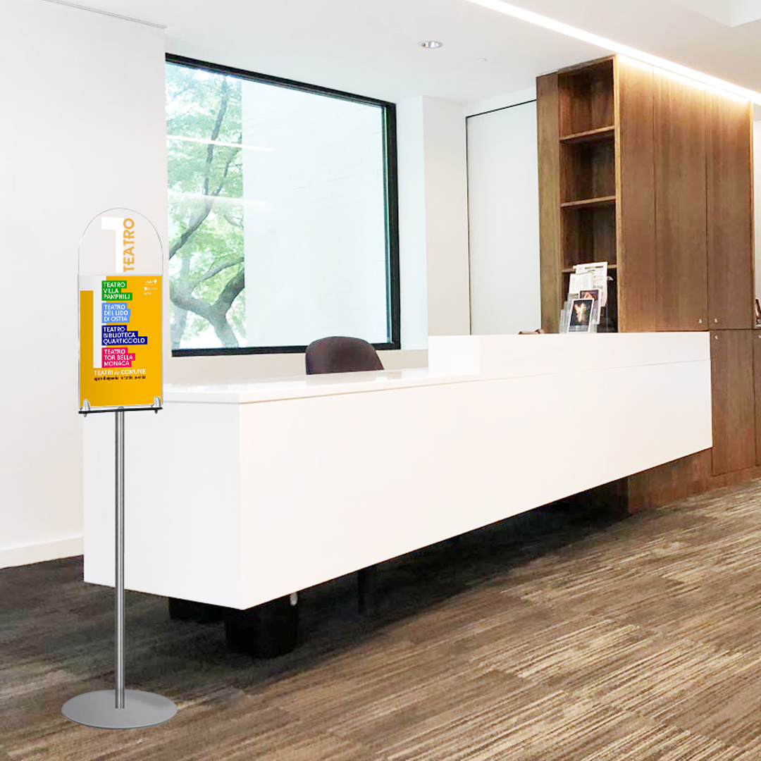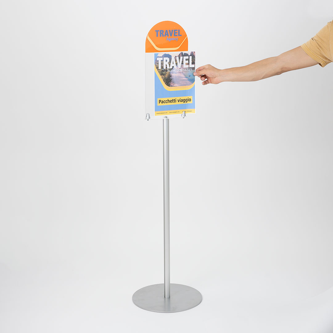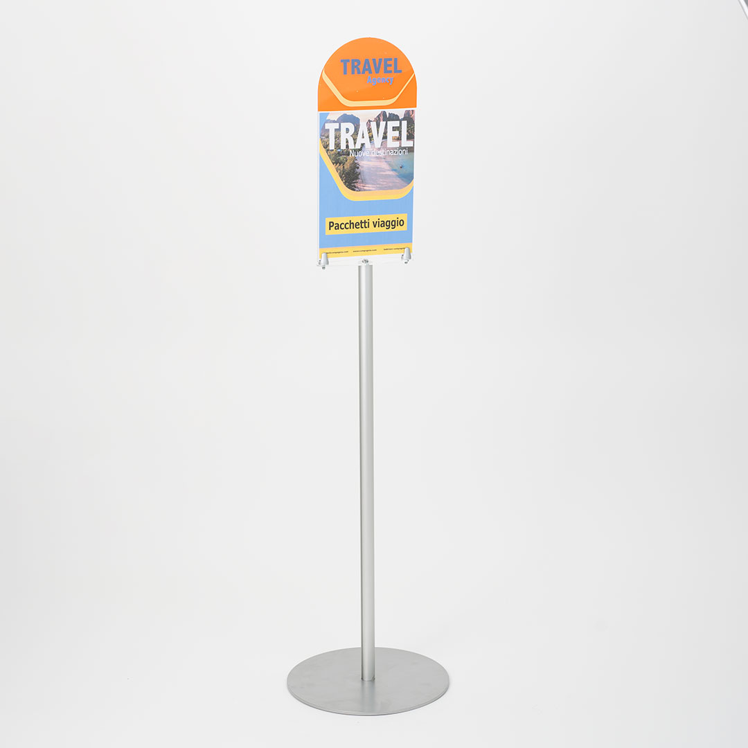 Espositore Porta avvisi da terra:- tasca bifacciale f.to A4;- crowner a mezza luna personalizzabile;- montante in alluminio dia. 30 mm;- base circolare in metallo;- versione silver e nera.