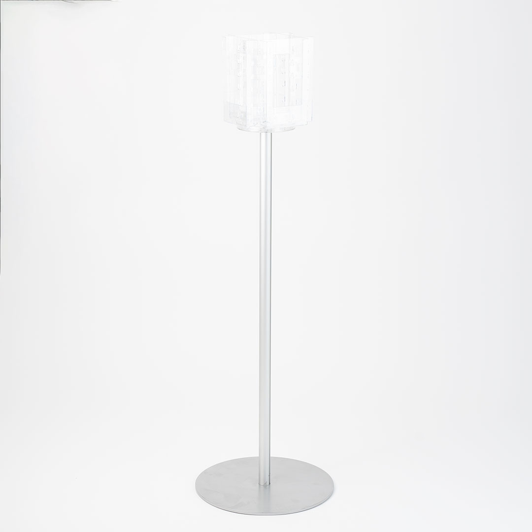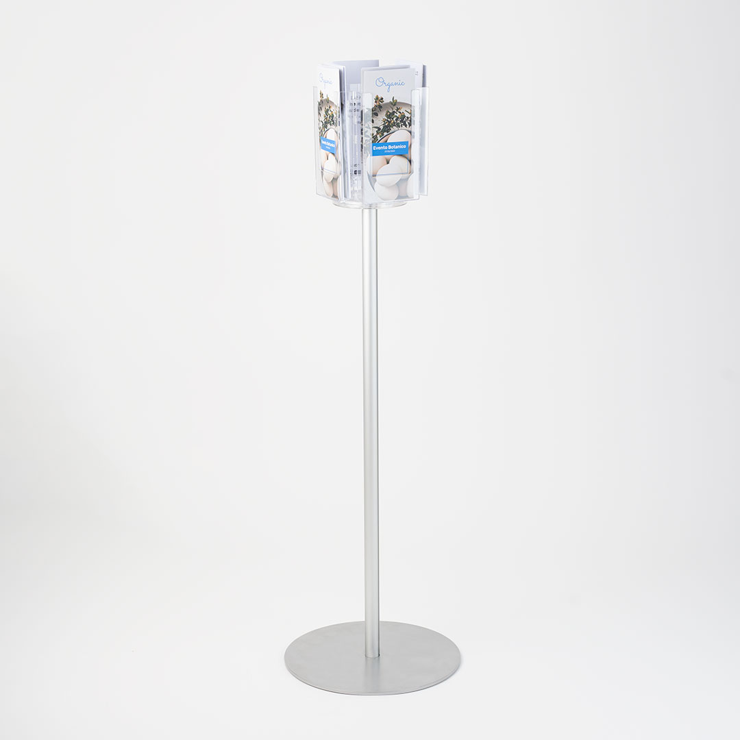 Espositore da terra con Porta depliant girevole:- 4 tasche f.to 1-3 A4 girevoli;- montante in alluminio dia. 30 mm;- base circolare in metallo;- versione silver e nera.