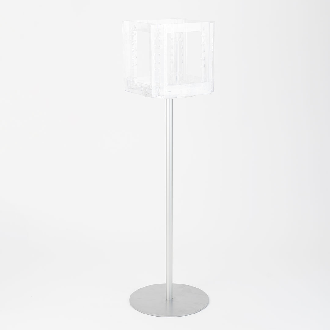 Espositore da terra con Porta depliant girevole:- 4 tasche f.to A4 girevoli;- montante in alluminio dia. 30 mm;- base circolare in metallo;- versione silver e nera.