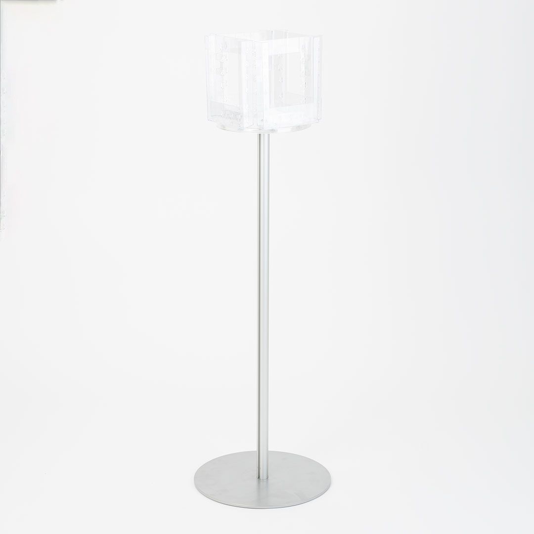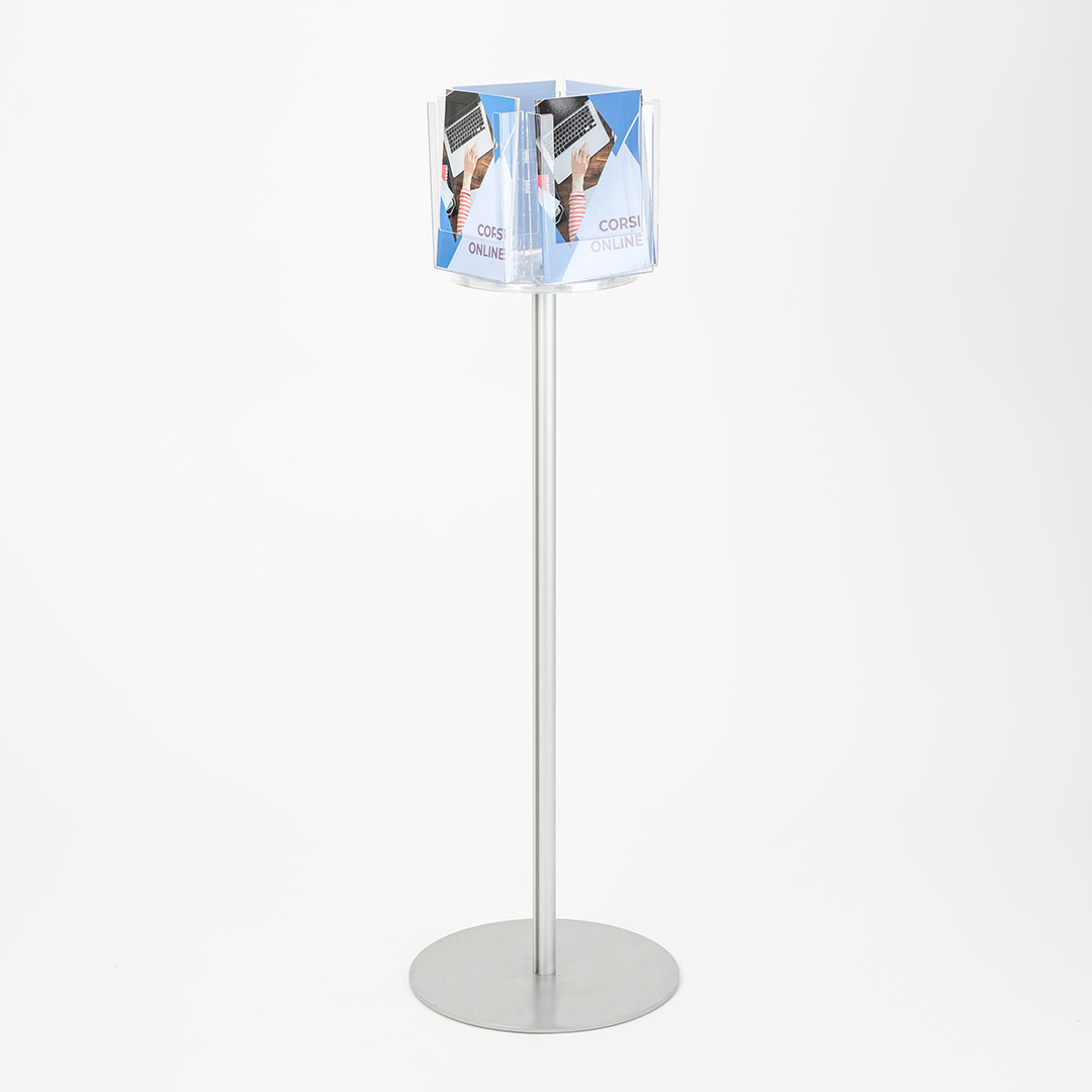 Espositore da terra con Porta depliant girevole:- 4 tasche f.to A5 girevoli;- montante in alluminio dia. 30 mm;- base circolare in metallo;- versione silver e nera.