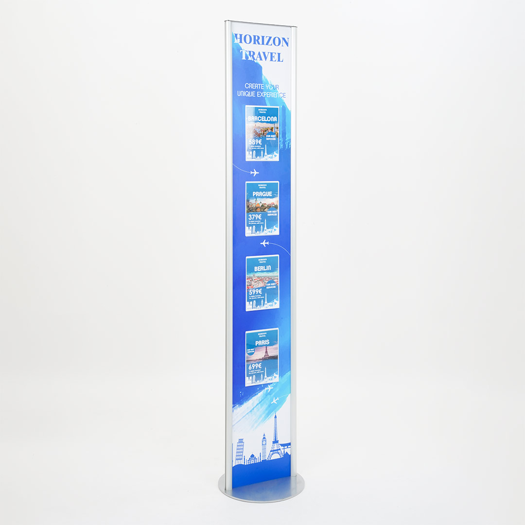 Perfetto per fiere, uffici e punti vendita, questo espositore offre un’eccezionale flessibilità. Le tasche trasparenti consentono una facile sostituzione dei messaggi, adattandosi rapidamente alle tue esigenze comunicative.