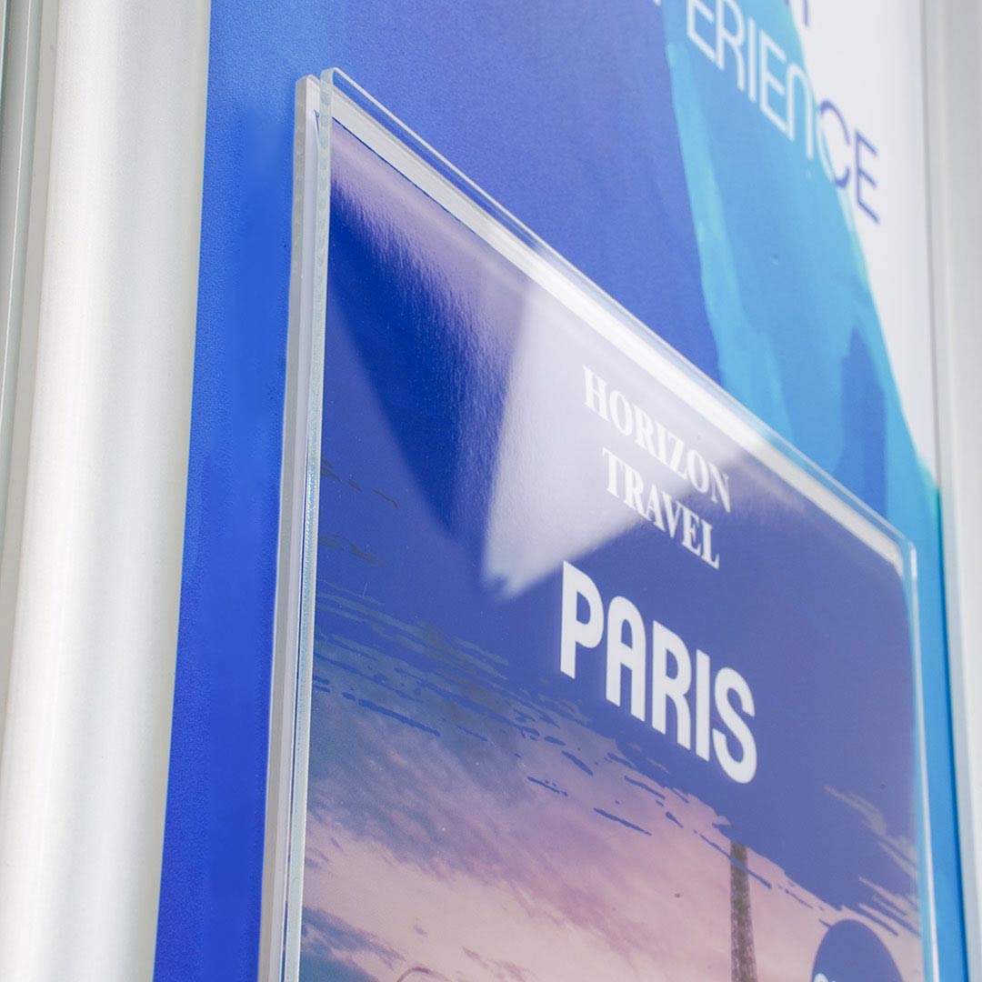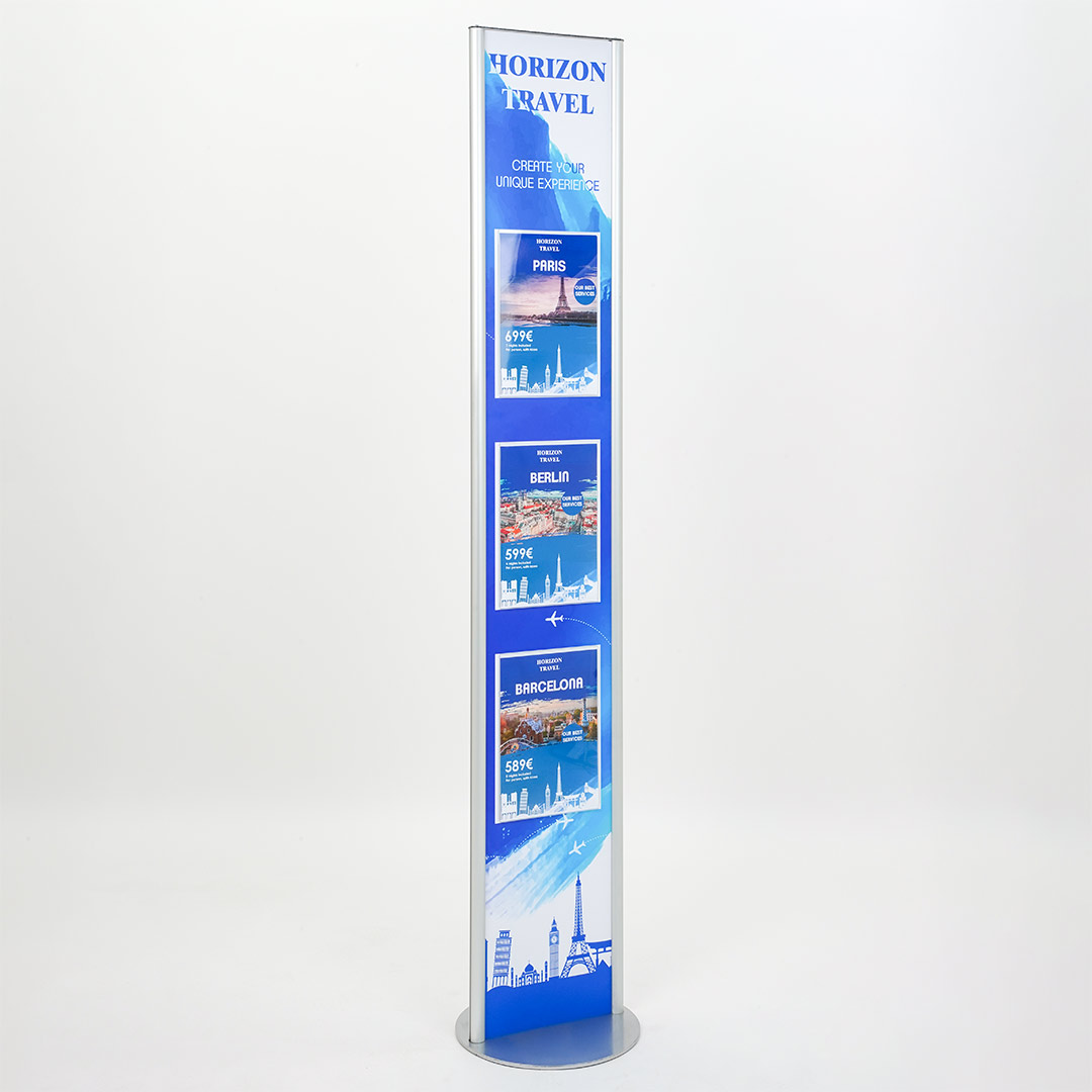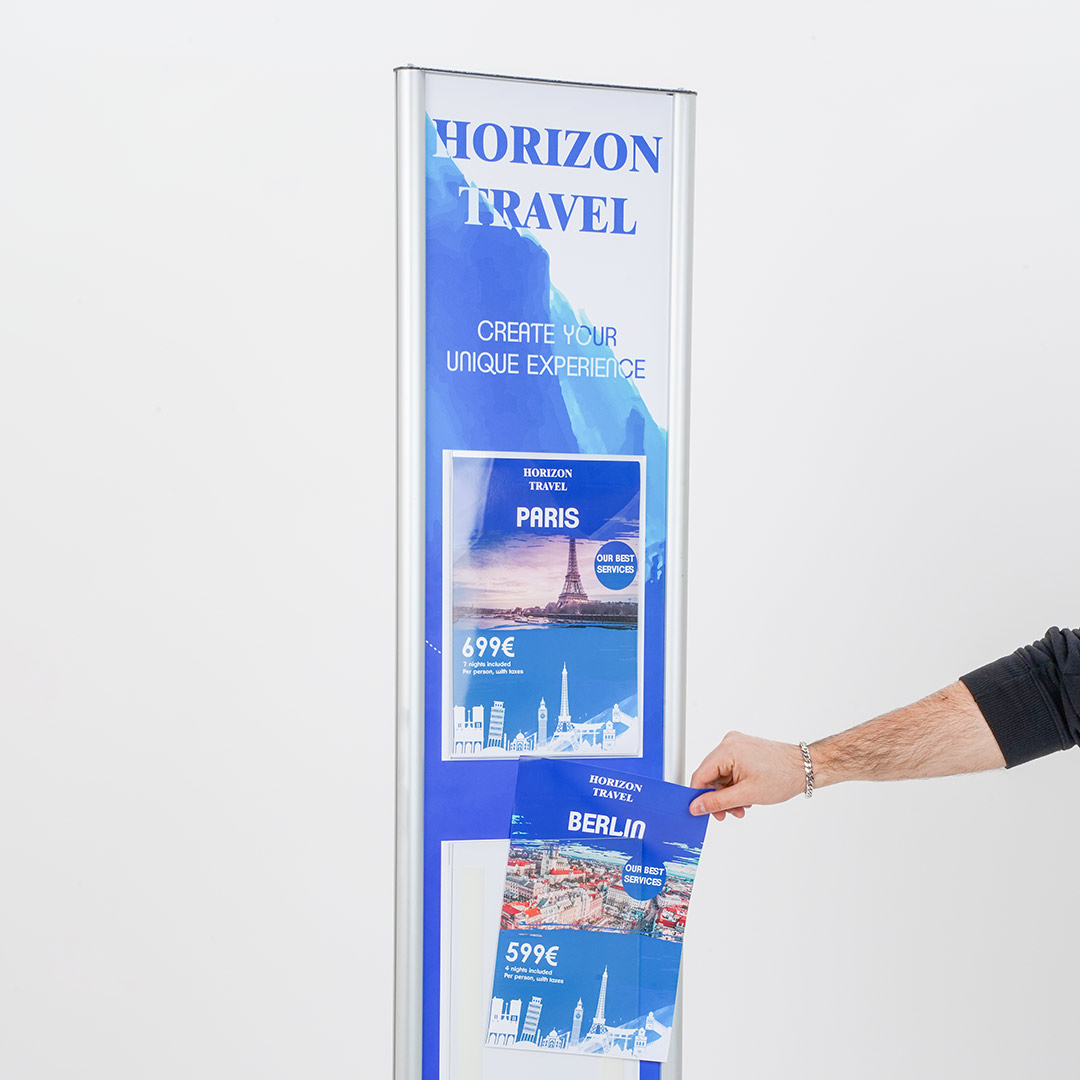 Perfetto per fiere, uffici e punti vendita, questo espositore offre un’eccezionale flessibilità. Le tasche trasparenti consentono una facile sostituzione dei messaggi, adattandosi rapidamente alle tue esigenze comunicative.