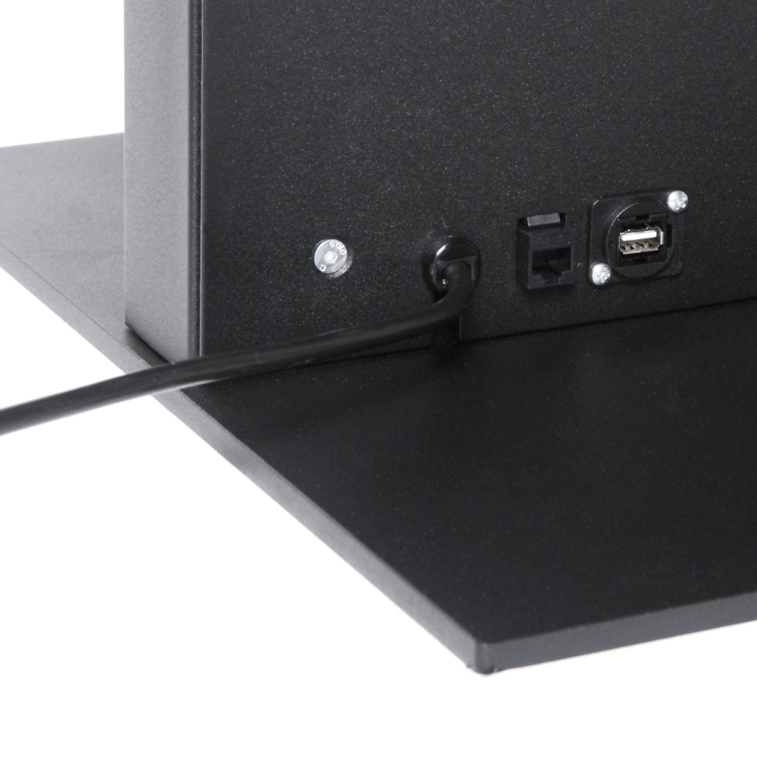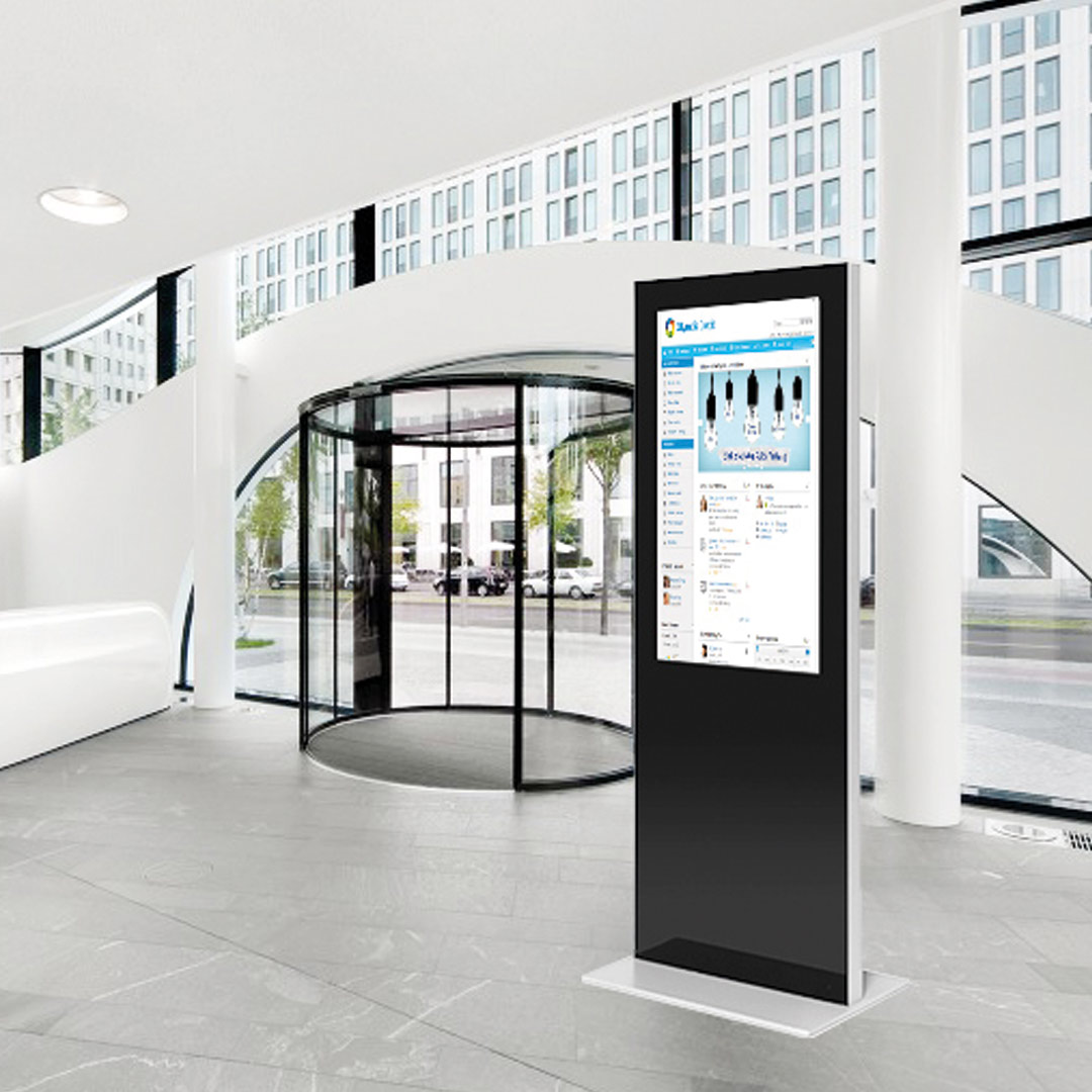 Compatibile con monitor fino a 50 mm di profondità, il totem offre un montaggio universale per schermi da 43″, 50″ e 55″. La connettività versatile permette di caricare contenuti tramite porte LAN, USB o connessione wireless, garantendo massima flessibilità operativa.