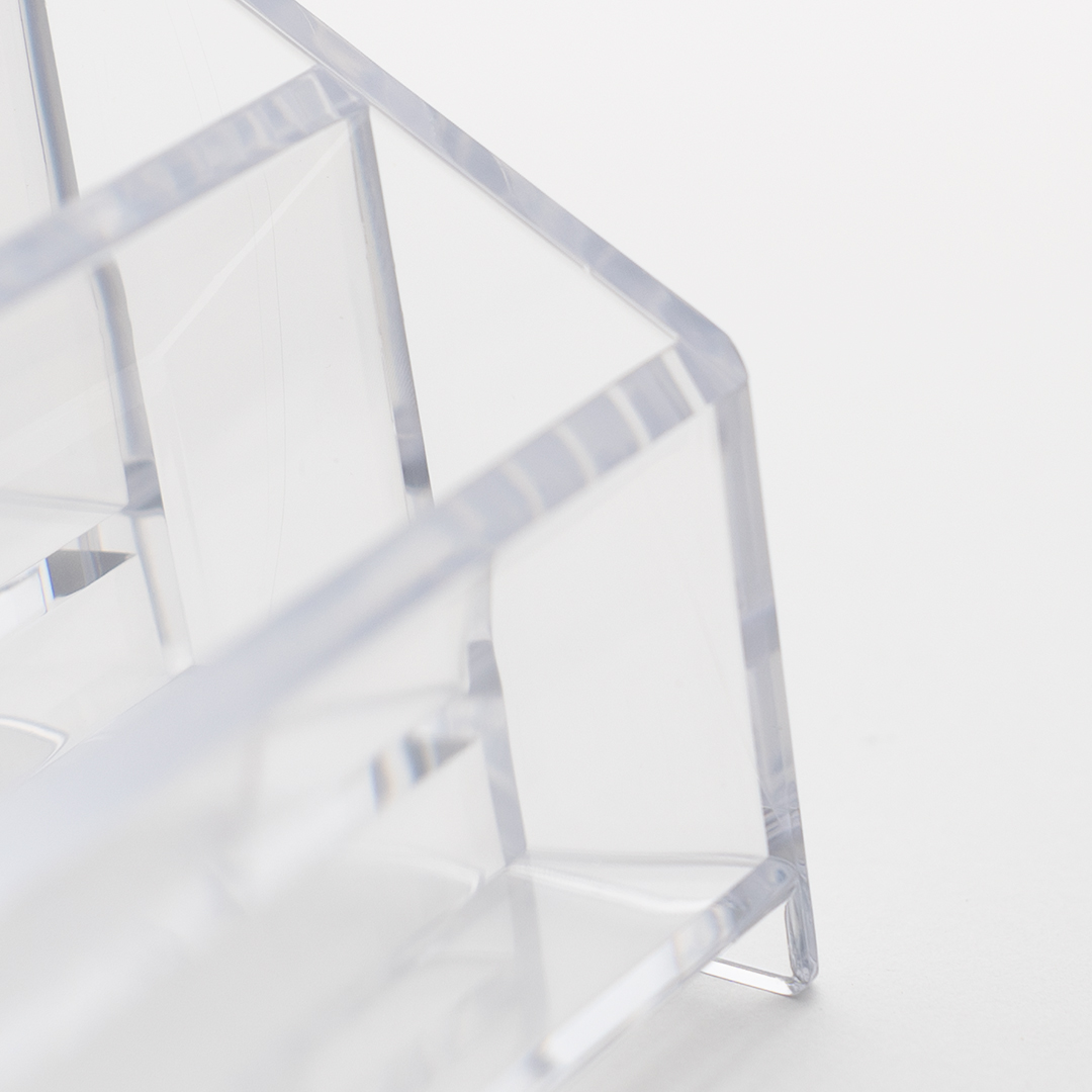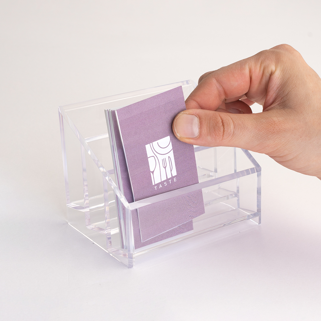 Porta biglietti da visita a 3 tasche per avere i biglietti da visita sempre in primo piano. Con i porta biglietti da visita multitasca, i tuoi biglietti diventano facilmente reperibili e in pochi istanti passeranno dalle tue mani a quelle dei tuoi clienti. I porta biglietti sono prodotti in materiale plastico trasparente per rendere ben visibile e riconoscibile il contenuto. Inoltre il plexiglass è noto per essere un materiale elegante che adatta ad ogni tipo di ambiente.