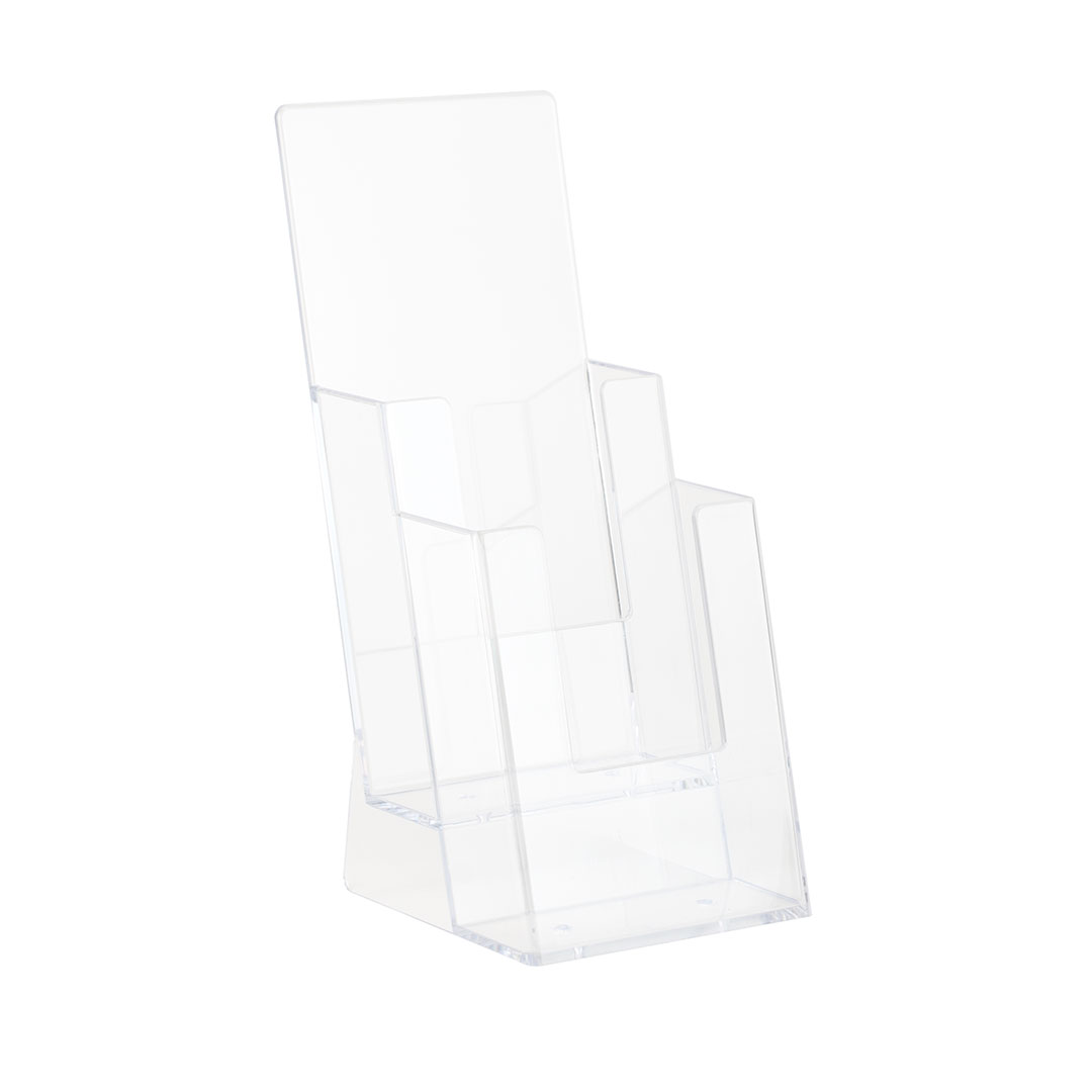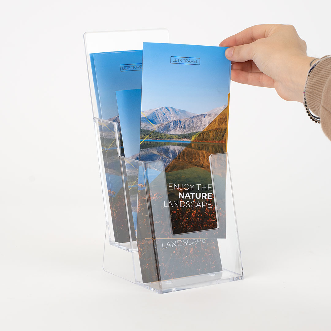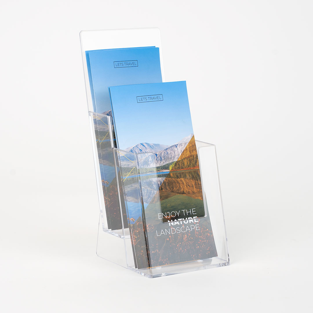 Realizzata in robusto plexi, questa porta depliant presenta due pratiche tasche che possono contenere depliant e brochure nel formato 1/3A4, garantendo una presentazione elegante e professionale dei tuoi prodotti o servizi.