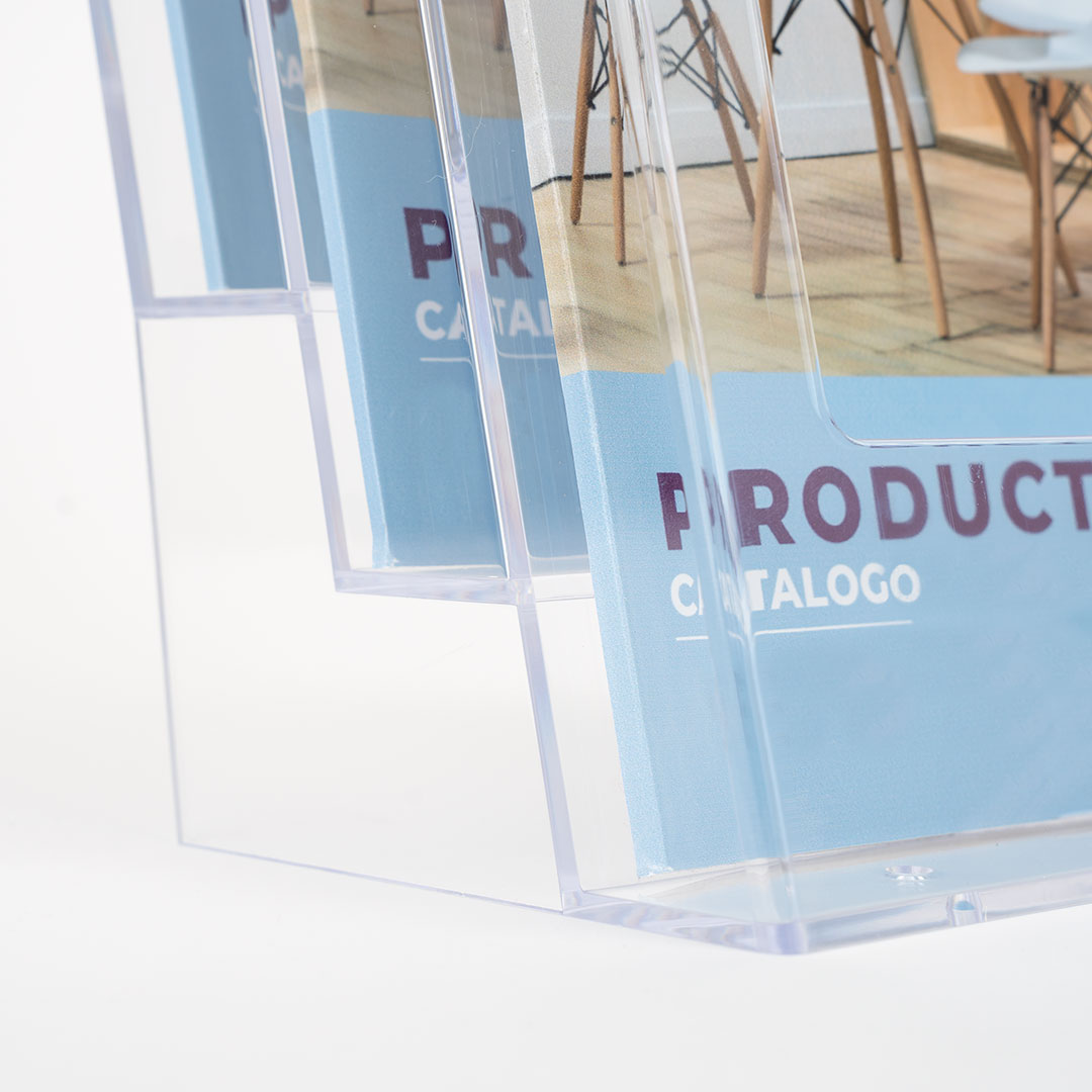 Versatile e adattabile a diverse esigenze, il porta depliant può essere posizionato su banconi, tavoli o scrivanie, rendendolo ideale per l’utilizzo in negozi, uffici, fiere, mostre e altri contesti espositivi. La sua praticità e facilità d’uso lo rendono uno strumento indispensabile per valorizzare al meglio i vostri materiali di marketing.