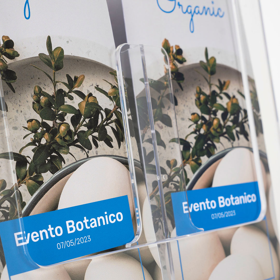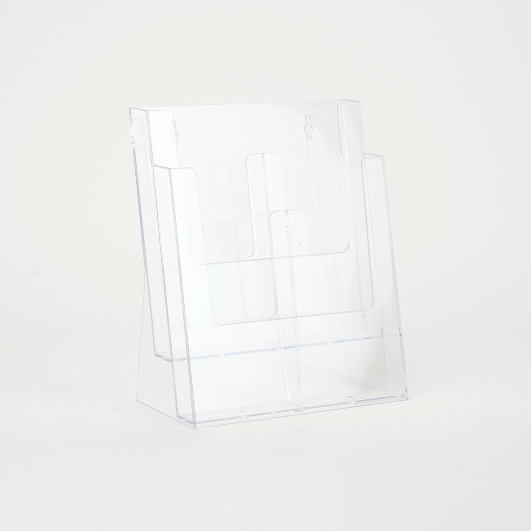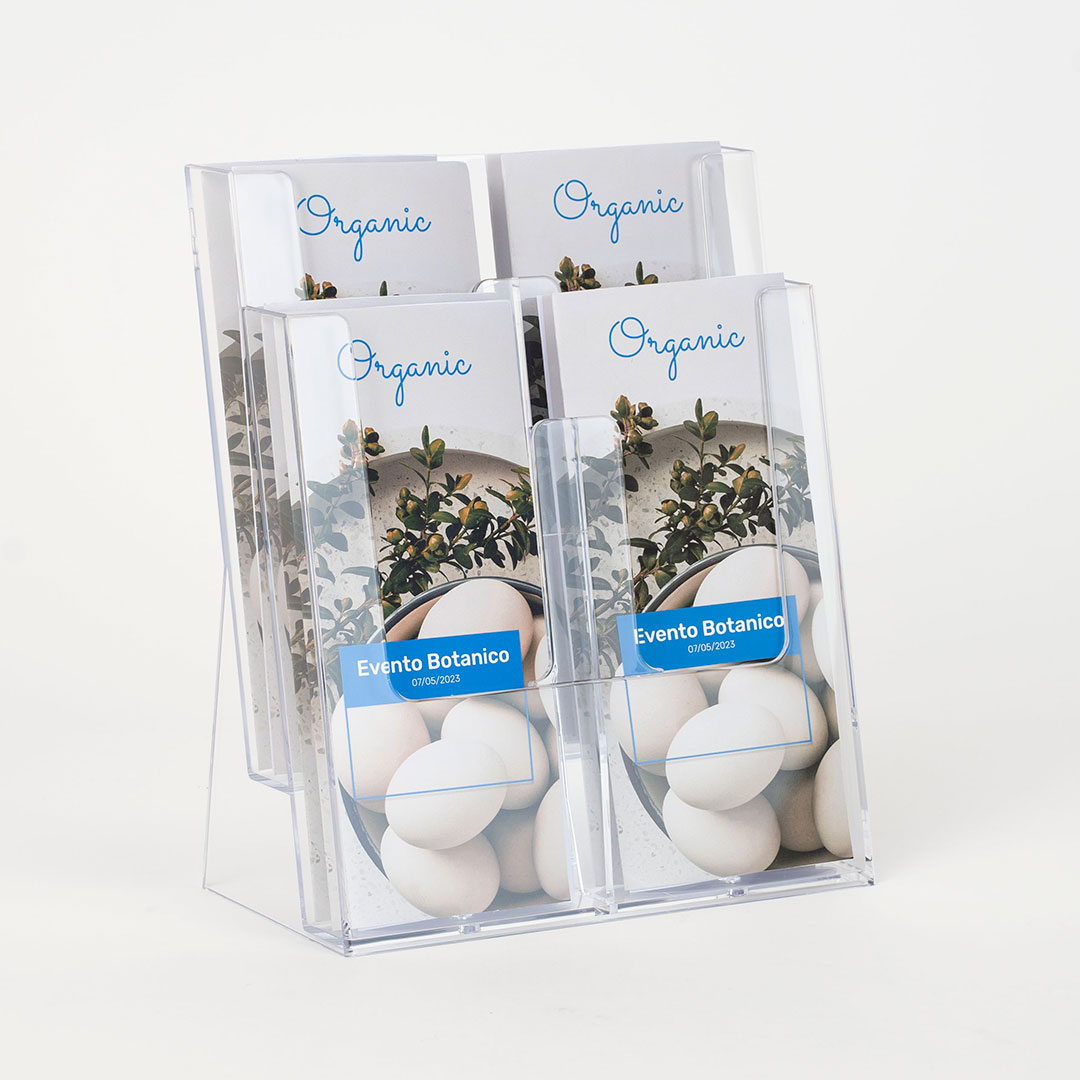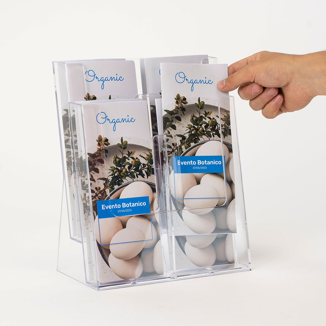 Con le sue 4 tasche in formato 1/3 A4 (10 x 21 H cm), disposte su due livelli, il porta depliant ti permette di organizzare e presentare in modo ordinato i tuoi materiali promozionali. La sua struttura a due piani ti consente di avere a portata di mano diverse tipologie di supporti, rendendo più semplice e immediata la consultazione da parte dei tuoi clienti.