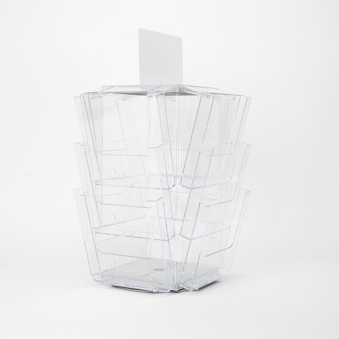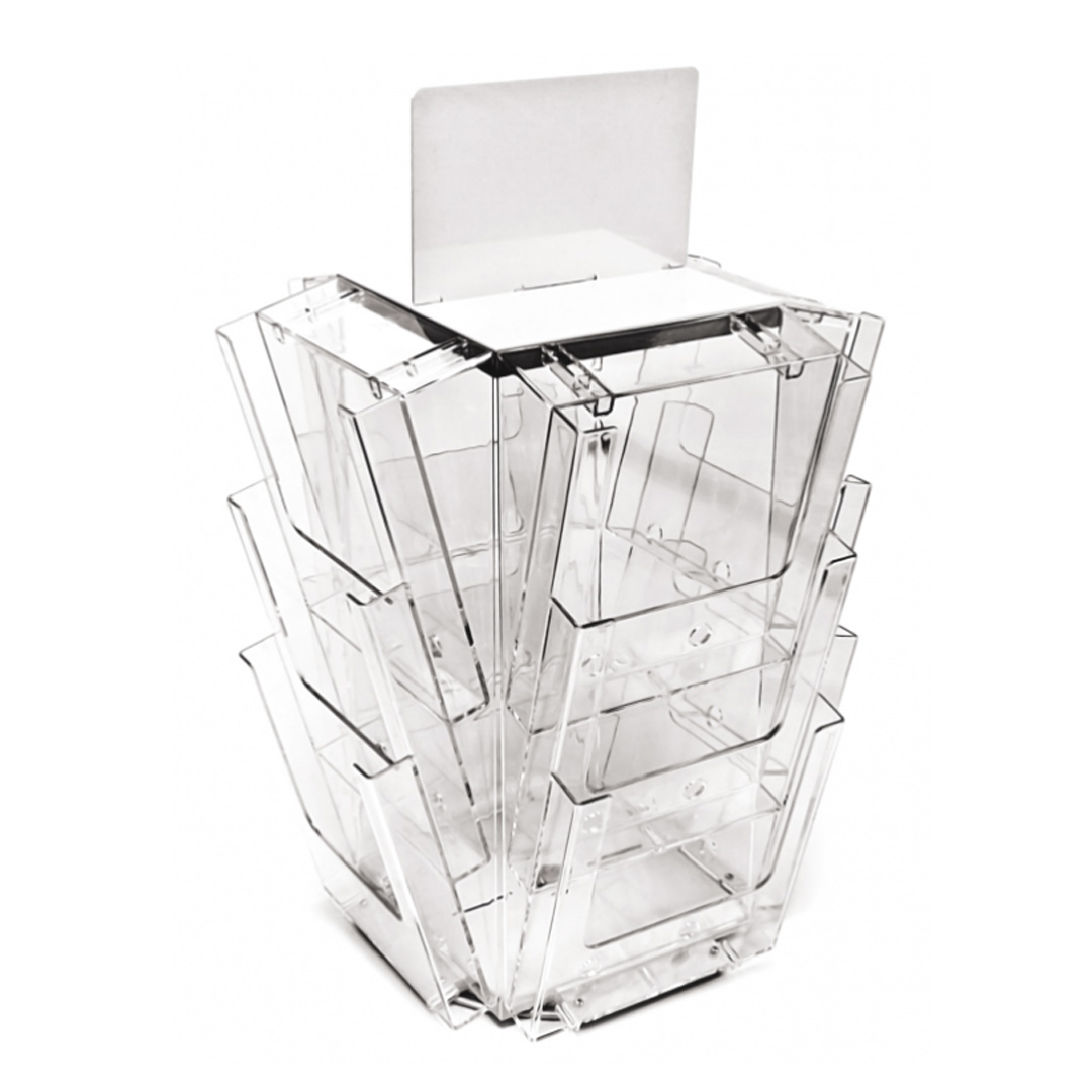 Modello disponibile: ITV01_0075 -Porta depliant da banco girevole in plexiglass a 12 tasche f.to A4 (21 x 30 h cm).