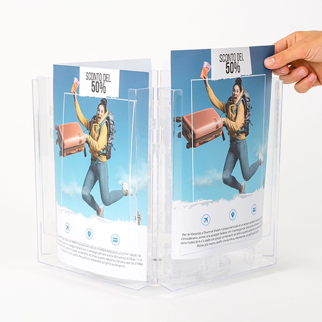 La struttura girevole a 360 gradi ti offre la massima flessibilità di posizionamento, consentendoti di esporre i tuoi depliant in modo più efficace e strategico. Grazie alle 4 ampie tasche, potrai organizzare e suddividere i tuoi materiali in modo razionale e funzionale.