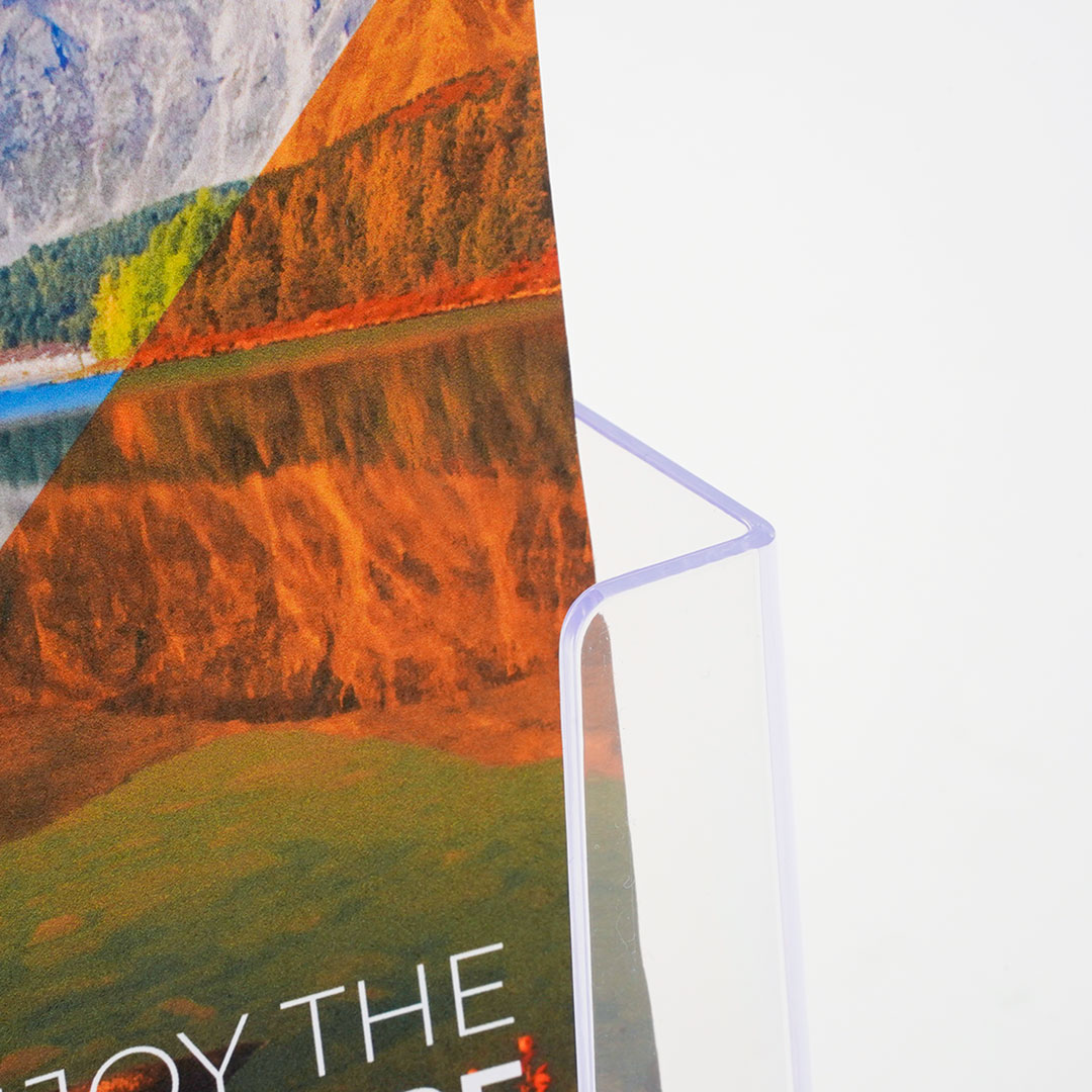 La linea SCRITTO® è pensata per banconi, scrivanie, tavoli, reception, ma anche per essere fissata a muro grazie ai due fori presenti nella parte posteriore, con formato 1/3 di A4, in stirene trasparente.