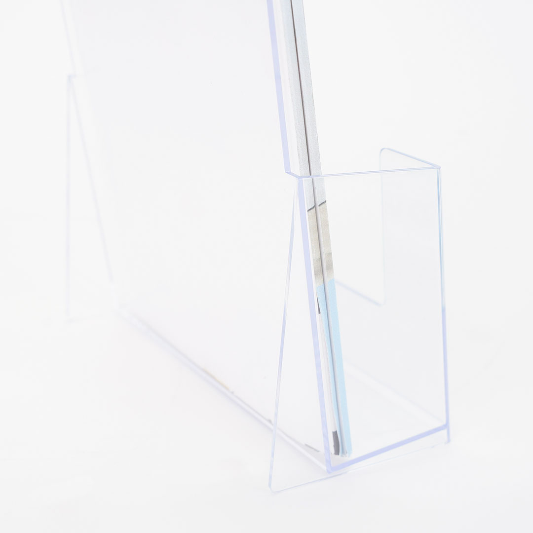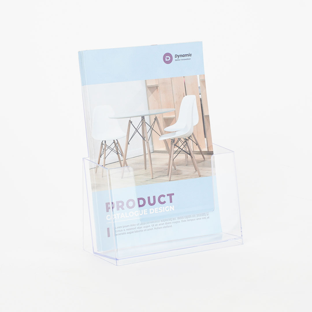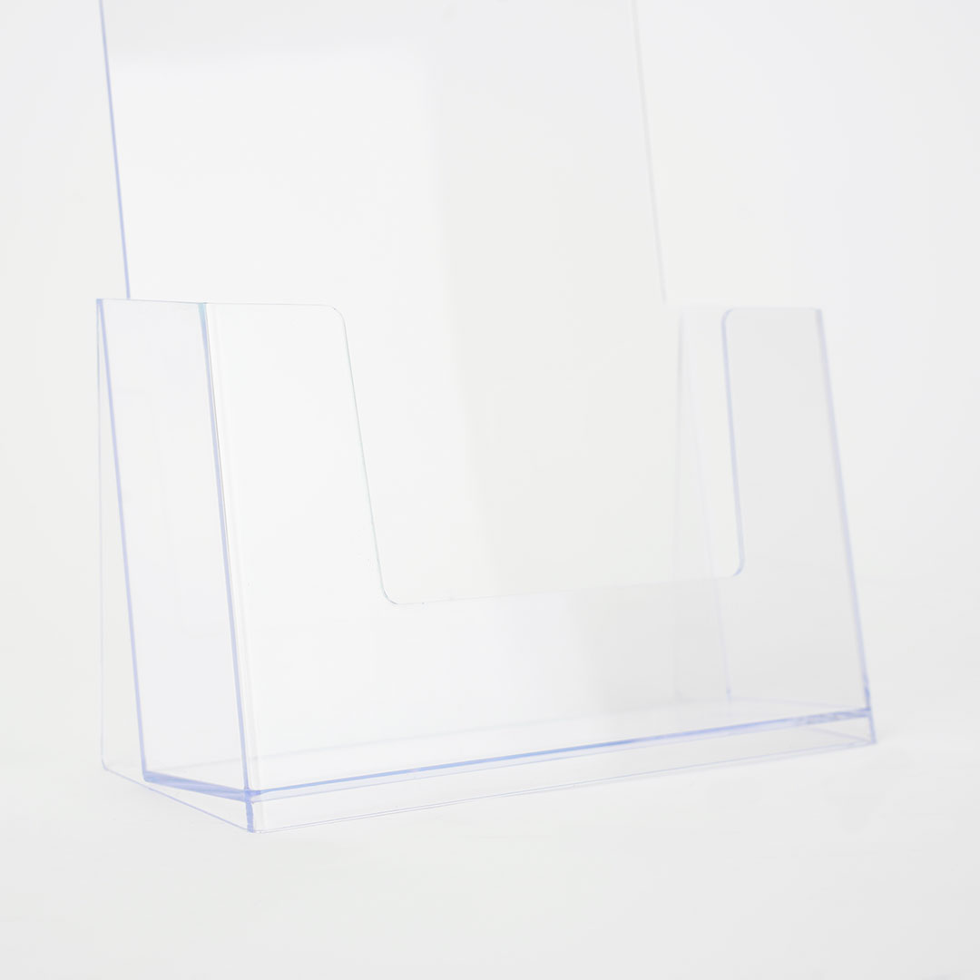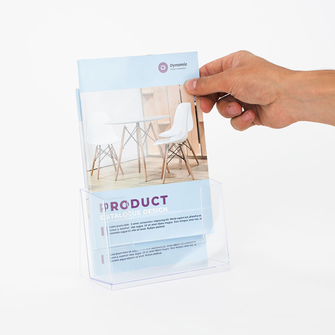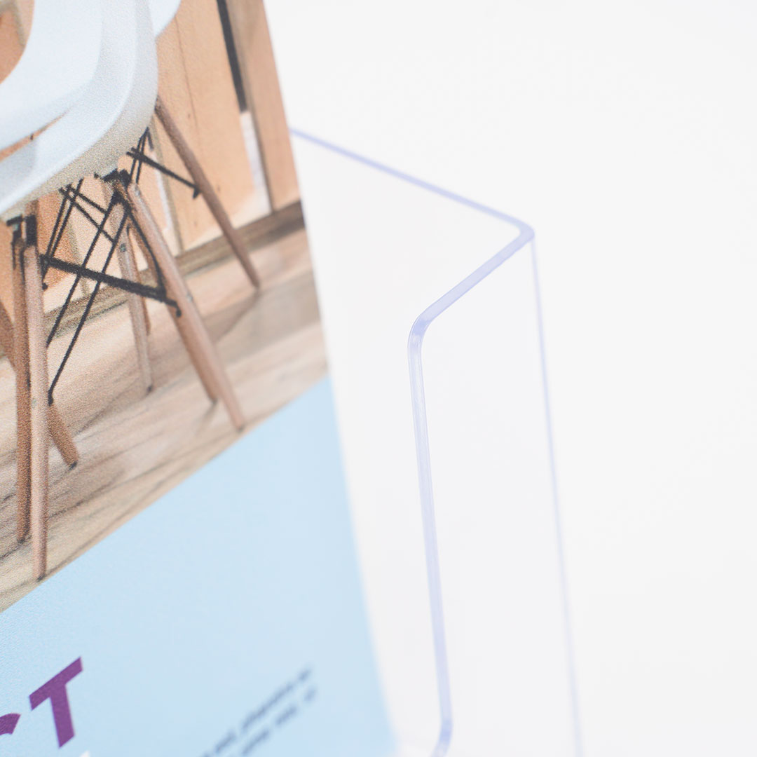 La linea SCRITTO® è stata ideata per valorizzare banconi, scrivanie, tavoli, reception e non solo. Grazie ai due fori presenti nella parte posteriore, è possibile fissare questi pratici porta depliant direttamente a muro, in formato A5 e realizzati in stirene trasparente.