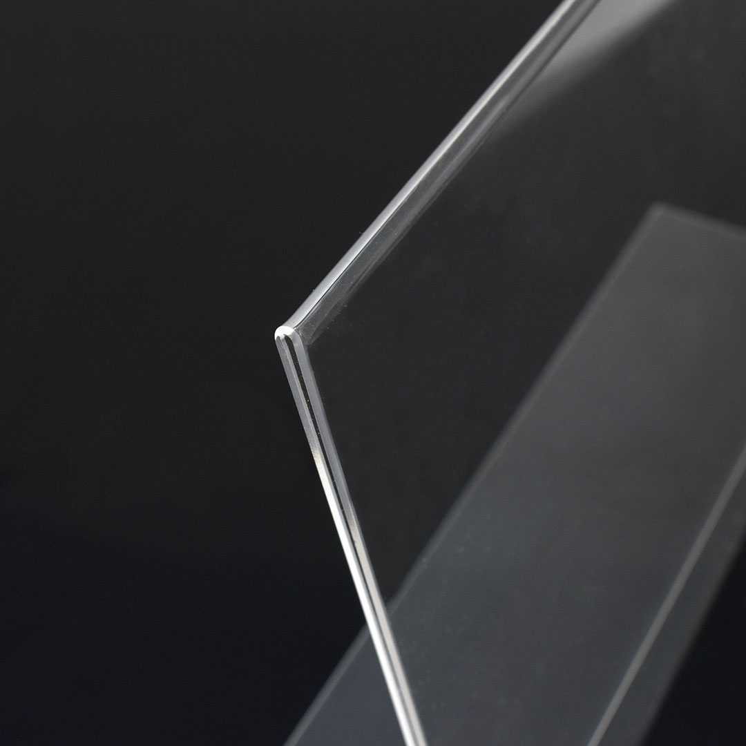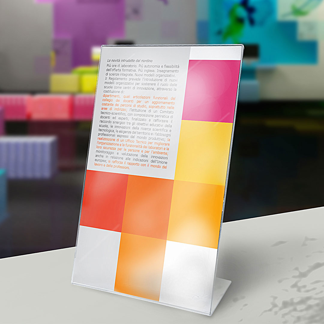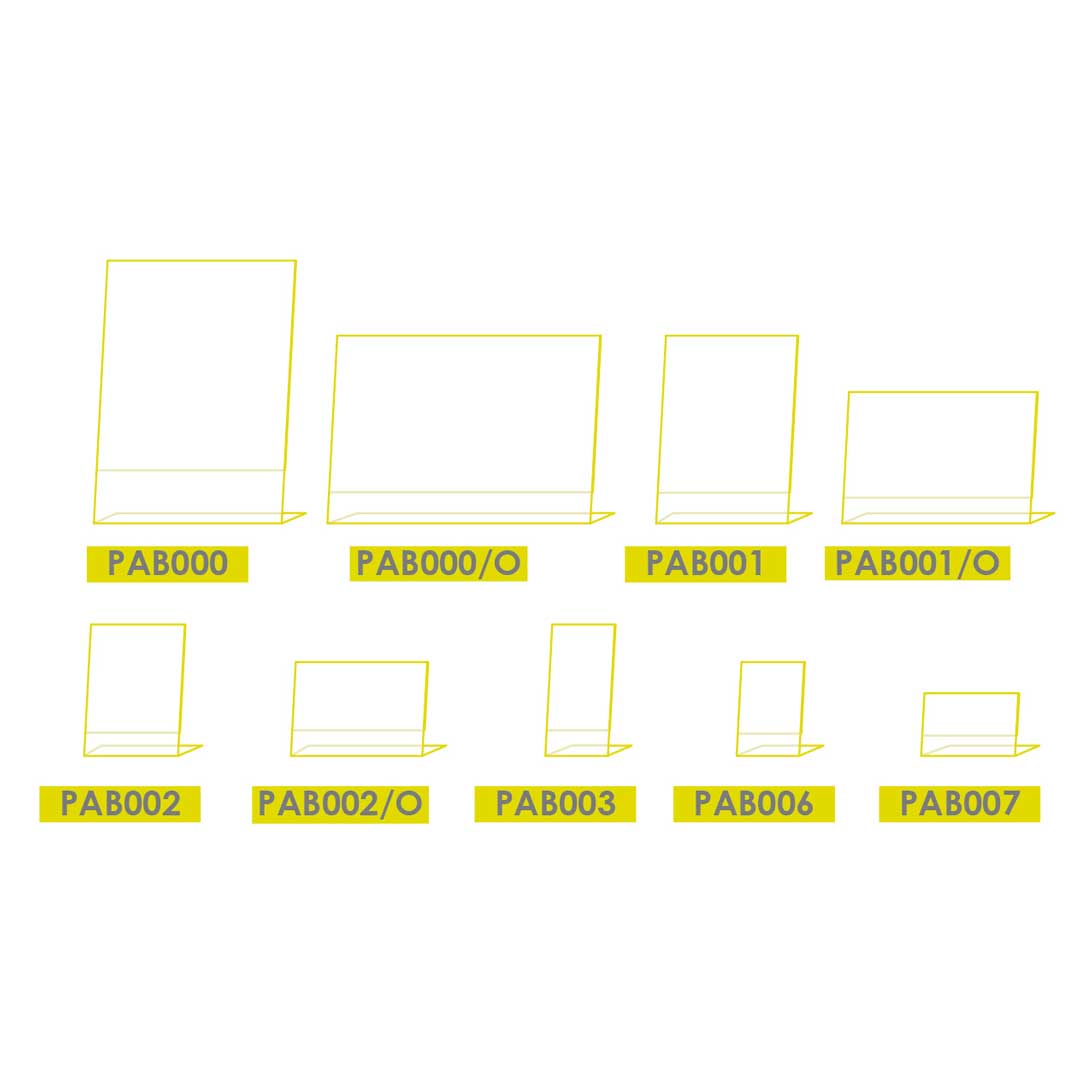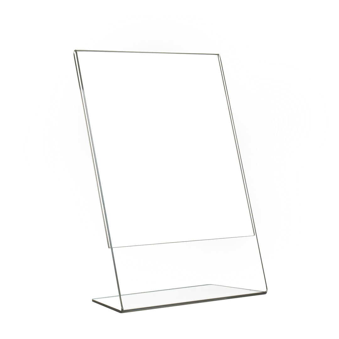 Realizzati in styrene trasparente, i nostri porta avvisi da banco presentano una base a forma di “L” e sono monofacciali, con inserimento laterale del foglio. Sono disponibili in diverse dimensioni, dal formato A3 verticale al formato A6 orizzontale, per soddisfare le esigenze di ogni attività.