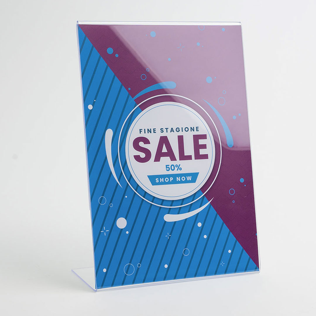 I porta avvisi da banco sono uno strumento versatile e pratico, utilizzato in numerosi contesti. Che si tratti di un negozio, un’azienda o un museo, questi supporti offrono una soluzione elegante per esporre avvisi, comunicazioni o informazioni.Nel negozio, i porta avvisi da banco possono essere utilizzati per mettere in evidenza un capo in saldo o i nuovi arrivi, attirando l’attenzione dei clienti. Nell’azienda, possono essere impiegati per esporre in modo ordinato e professionale degli avvisi o delle comunicazioni ai dipendenti o agli ospiti in visita. Nei musei, inoltre, possono segnalare l’area ticket o il guardaroba.Realizzati in styrene trasparente, i nostri porta avvisi da banco presentano una base a forma di “L” e sono monofacciali, con inserimento laterale del foglio. Sono disponibili in diverse dimensioni, dal formato A3 verticale al formato A6 orizzontale, per soddisfare le esigenze di ogni attività.