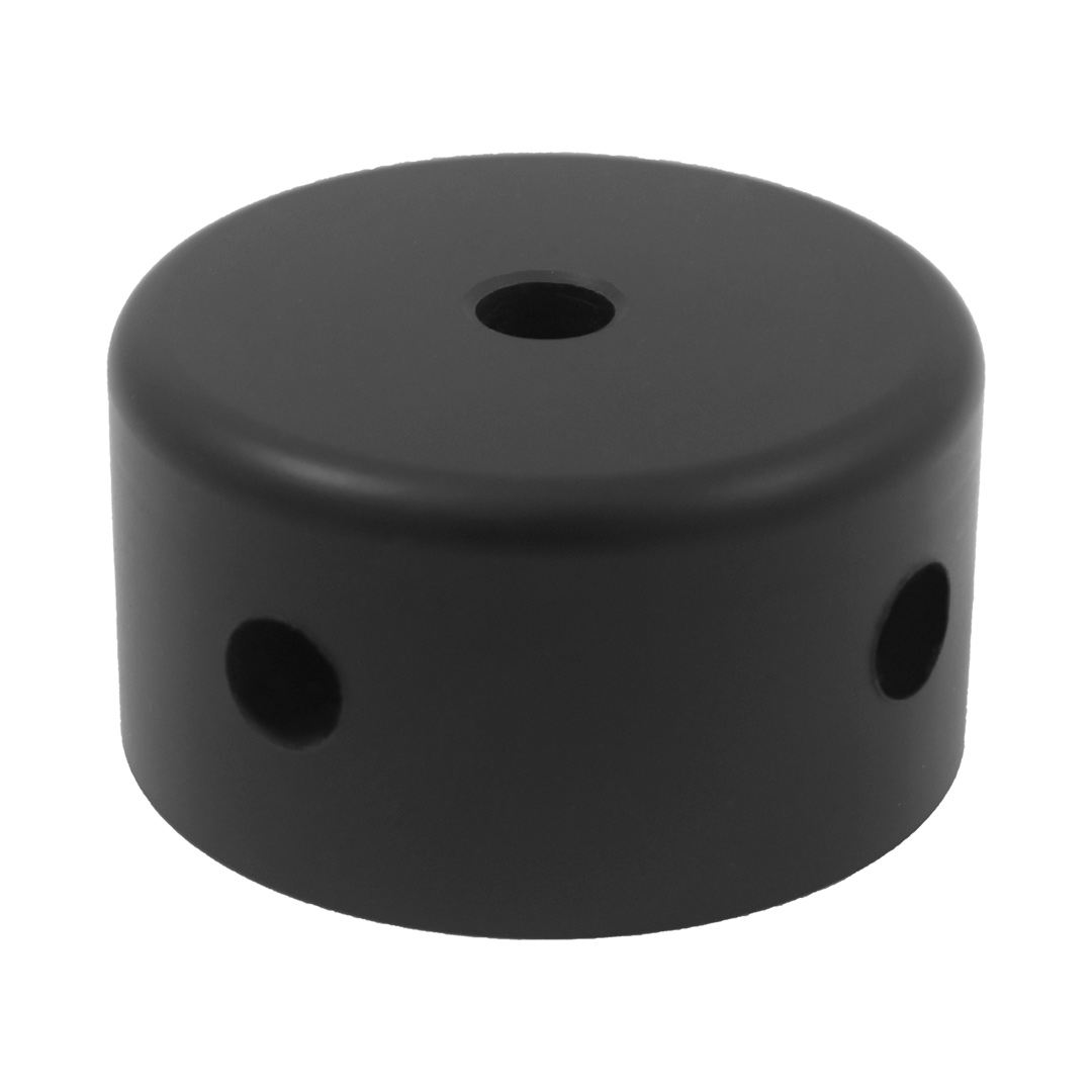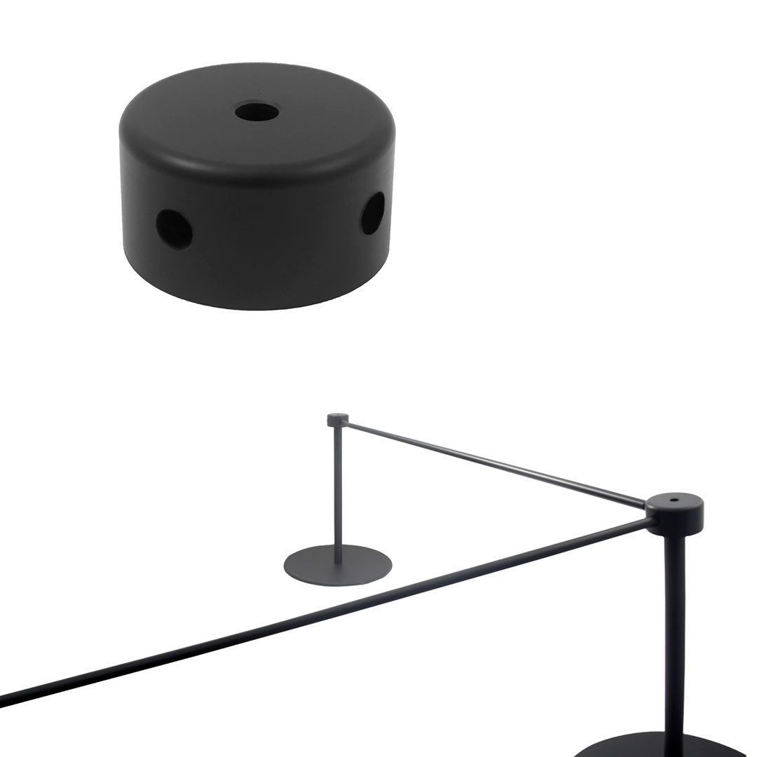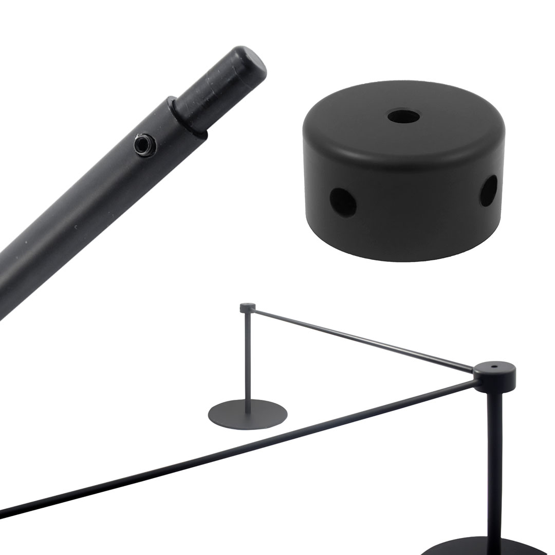 Il tappo di concatenazione, realizzato in PVC nero, presenta 4 fori strategici che permettono molteplici configurazioni della barra. La sua versatilità si estende alla compatibilità con le colonnine Museum sia da 45 cm (ITV16_0001) che da 90 cm (ITV16_0002), garantendo flessibilità nell’organizzazione degli spazi.