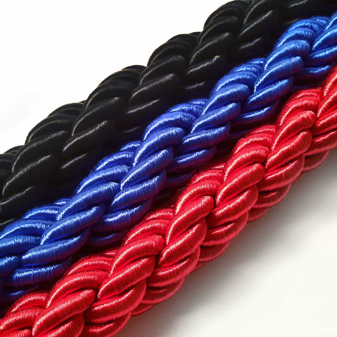 Cordone intrecciato:- con moschettoni finitura gold;- lunghezza 2 metri, diametro 30mm;- colori disponibili: Blu, Rosso o Nero.