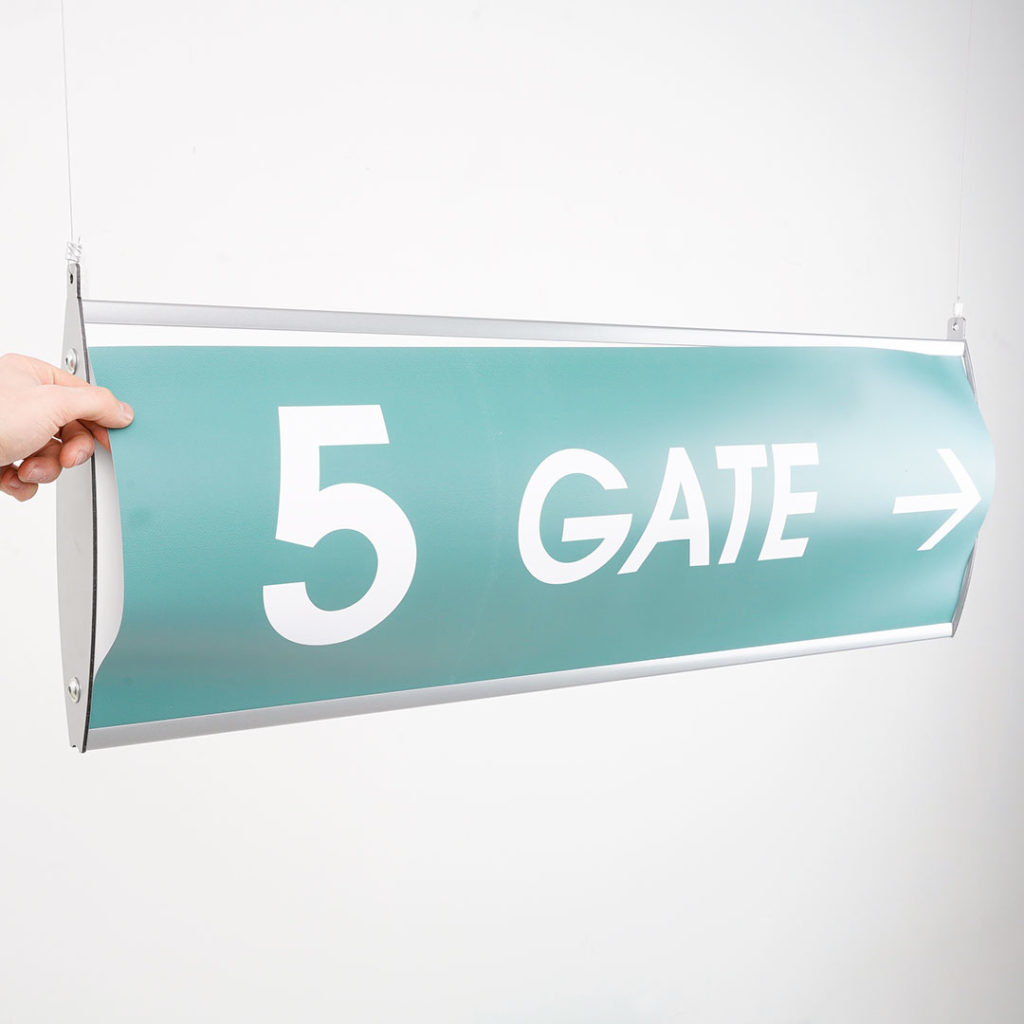 Targa a sospensione Linea GENIUS: segnaletica bifacciale per esterni di grande impatto