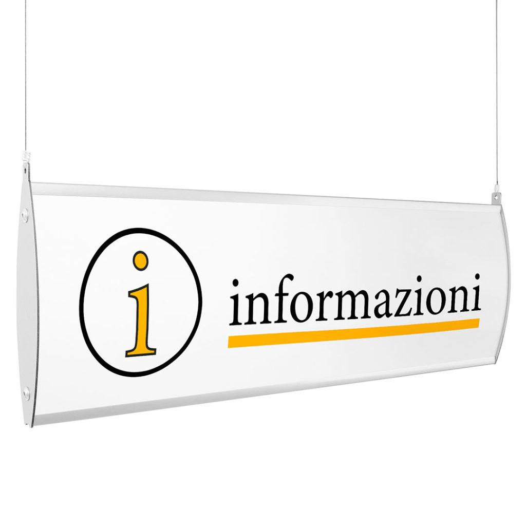 Targa Linea Genius- a sospensione;- profili in alluminio verniciati a polveri silver;- doppio pannello di fondo in lamiera preverniciata bianca;- superficie convessa;- terminali in metallo verniciato a polveri silver;- grafica in vinile adesivo laminato;- per uso esterno.